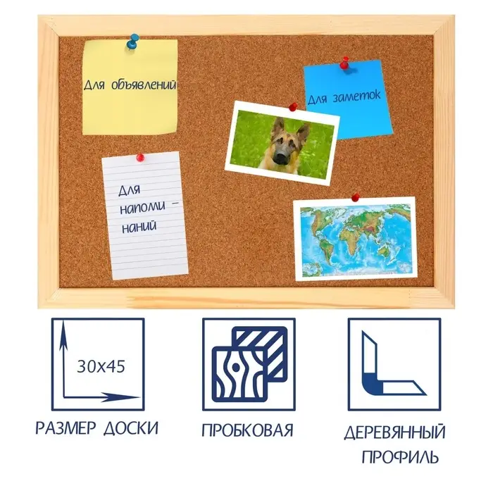 Поверхность из пробки удобно использовать для крепления записок, фотографий и списков дел. Это как «личная зона напоминаний», где всё важное собрано в одном месте. Деревянная рамка добавляет ощущение уюта и аккуратно вписывается в интерьер — от рабочего кабинета до домашнего пространства.