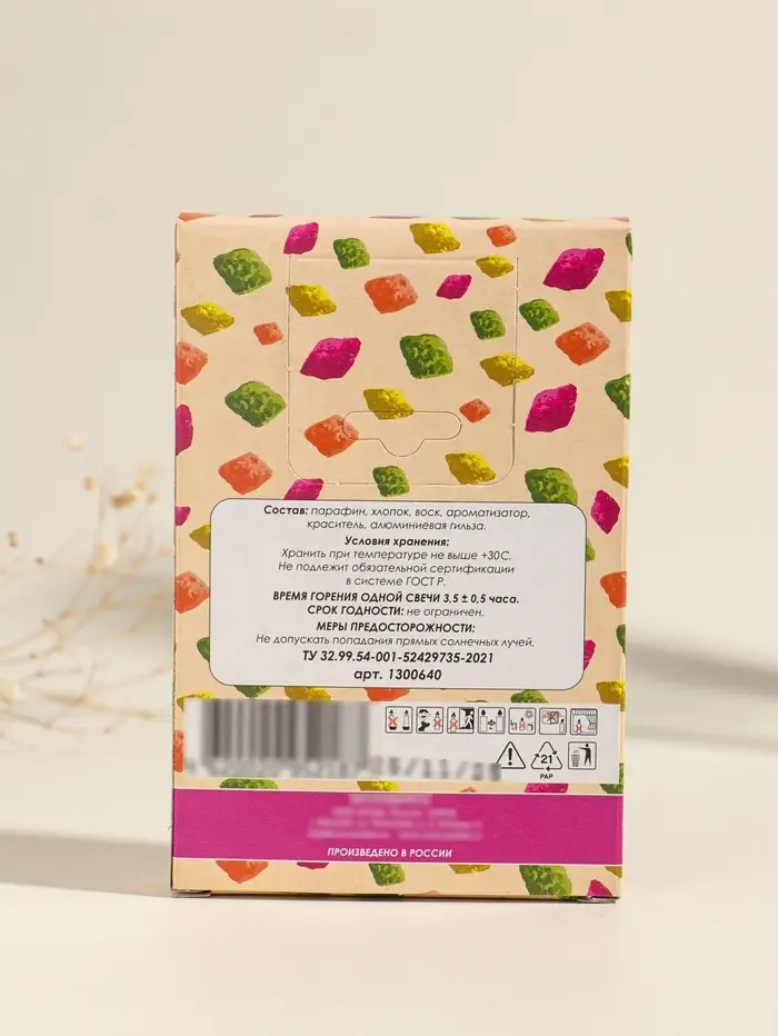 Набор из шести ароматических свечей-гильз создаёт уютную и сладкую атмосферу. Каждая миниатюрная свеча — это капля ностальгии по вкусу любимых конфет, превращённая в тёплый, мерцающий свет. Универсальный дизайн делает набор идеальным акцентом для любого повода — от тихого вечера с книгой до праздничного застолья.