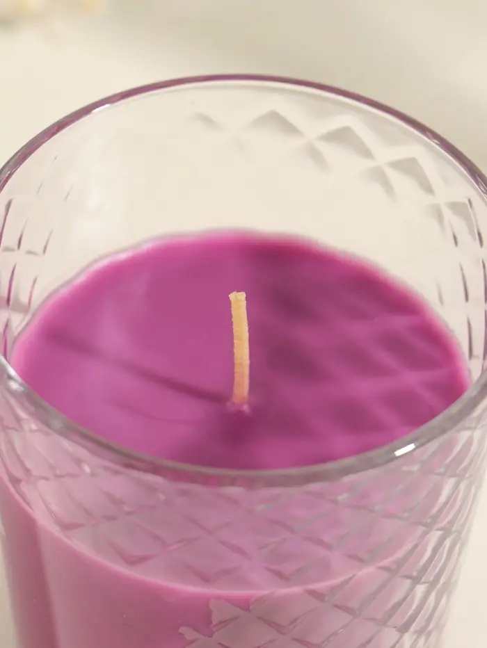 - Удобная и безопасная форма в стеклянном стакане сиреневого оттенка.