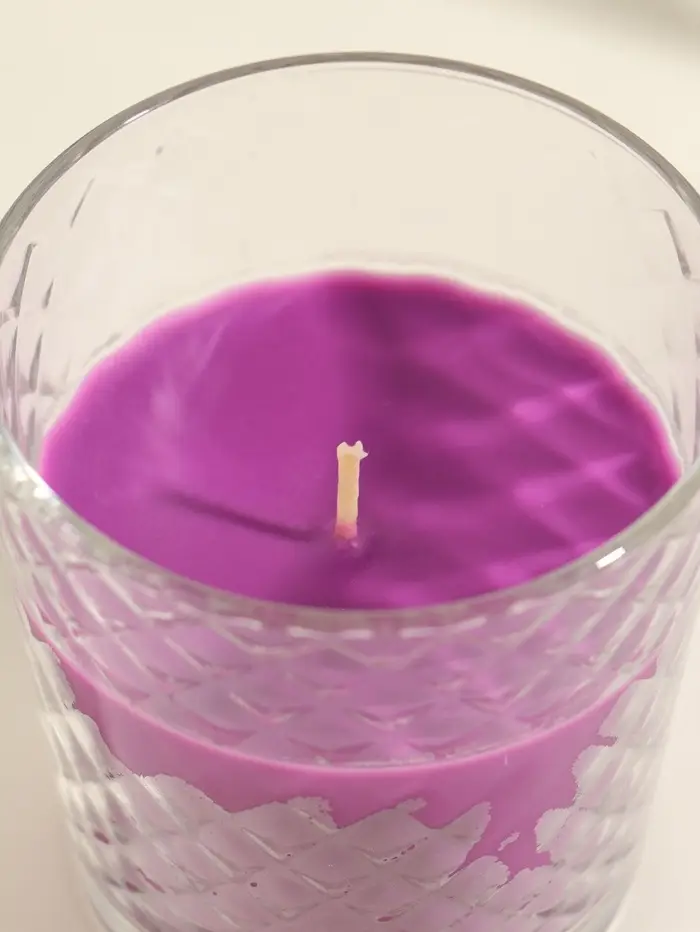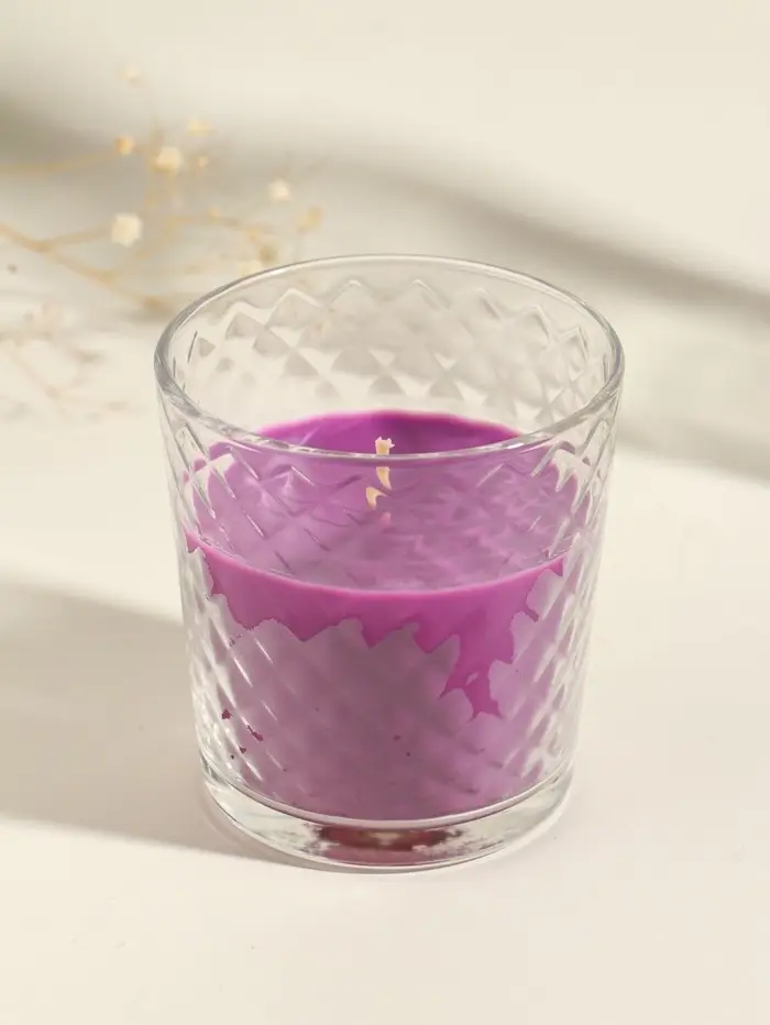 - Устойчивая свеча в стеклянном стакане фиолетового оттенка — одновременно источник света и стильный элемент декора.