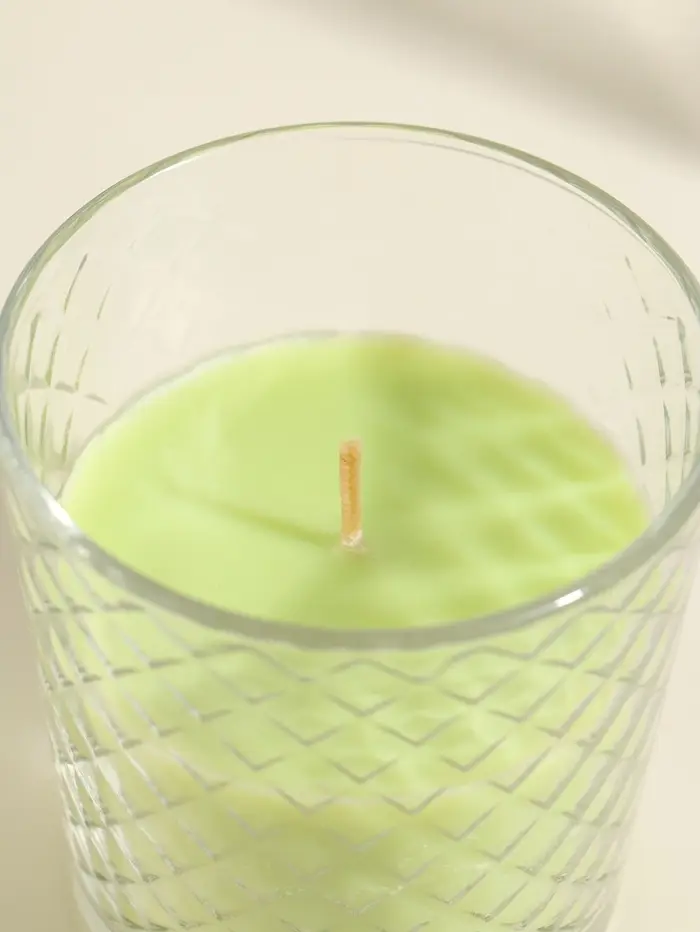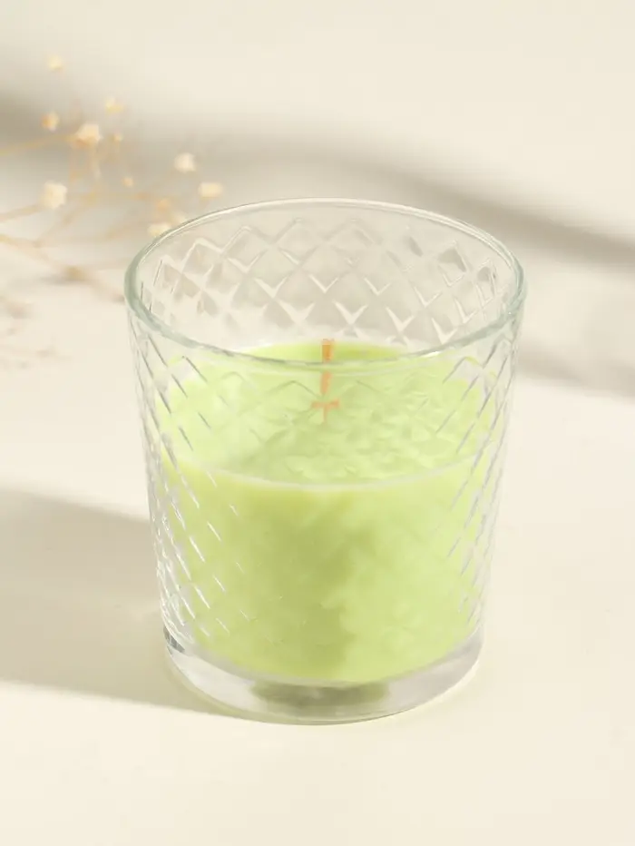 - Свеча заключена в прочный стеклянный стакан зелёного оттенка, который гармонирует с её ароматической темой.