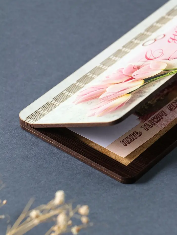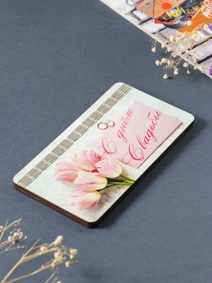 Купюрница свадебная "С днём свадьбы" розовые тюльпаны, 19х9,5х0,7 см, вид 1