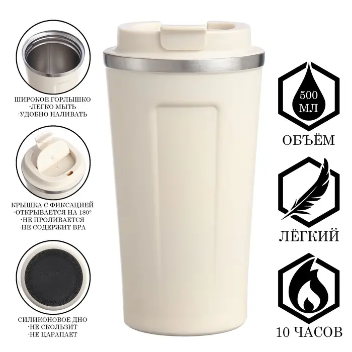 Термокружка выполнена из 304 нержавеющей стали, сконструирована по вакуумной технологии, с двойной стенкой, следовательно, долго держит тепло и не проливается. Снабжена откидывающейся крышкой на 180°, изготовленная из экологичного пищевого пластика, имеется фиксатор, возможность с легкостью использовать термокружку одной рукой. На дне, термокружка имеет специальную прорезиненную основу, предотвращающую царапины на поверхностях.