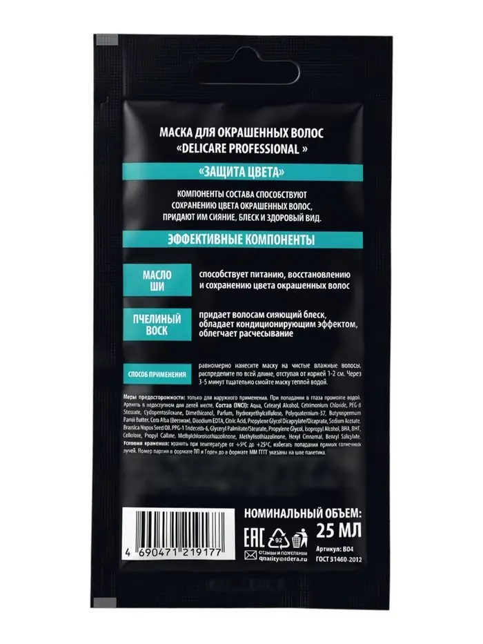 Маска‑саше для окрашенных волос Delicare Professional, с пчелиным воском, 25 мл