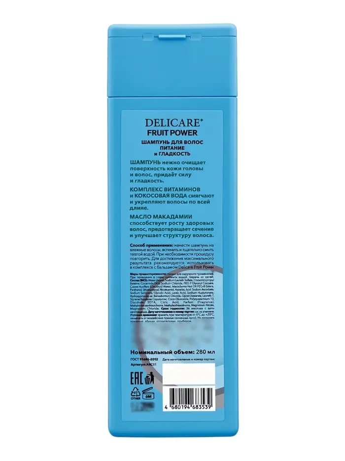 Шампунь для волос Delicare Fruit Power, питание и гладкость, с кокосом, 280 мл