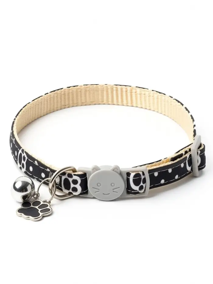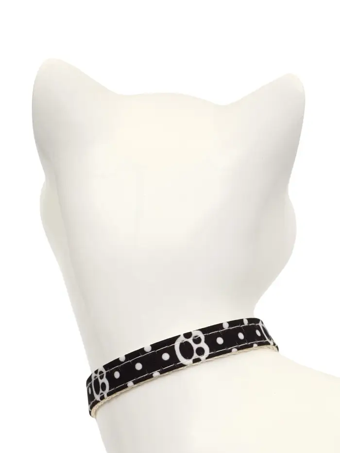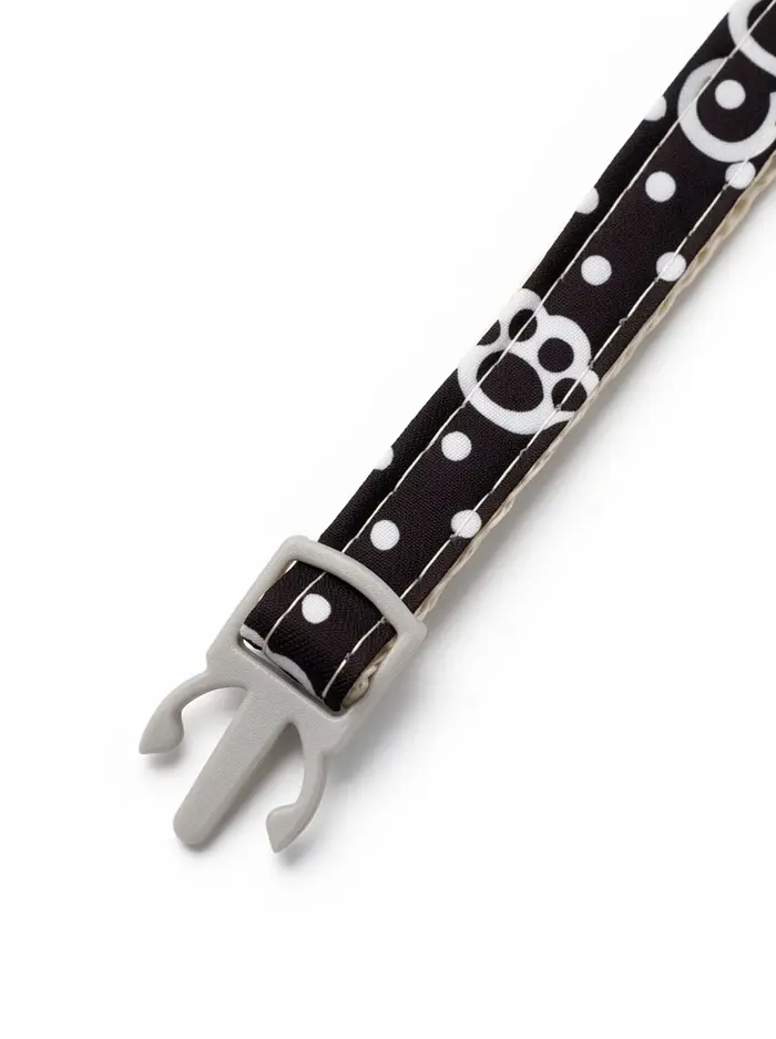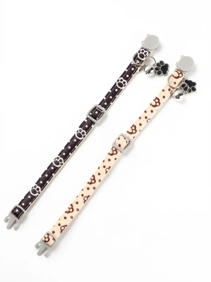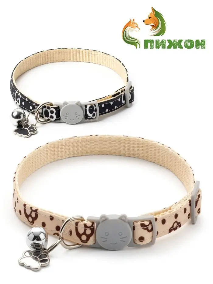 Набор ошейников «Лапки» — два стильных и безопасных аксессуара для кошек разного возраста и размера. Ошейники выполнены из прочного полипропилена, оснащены застёжкой-фастекс, бубенчиком и декоративной подвеской в виде лапки. В комплекте — бежевый и чёрный варианты с нежным рисунком.