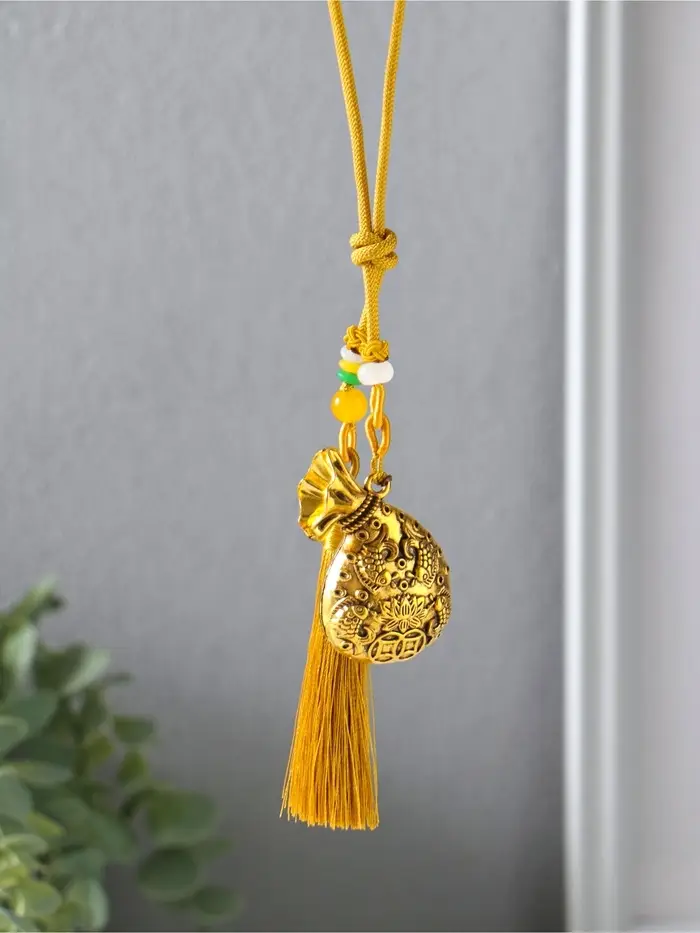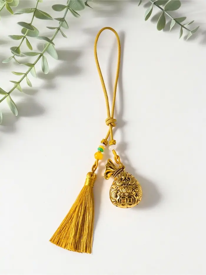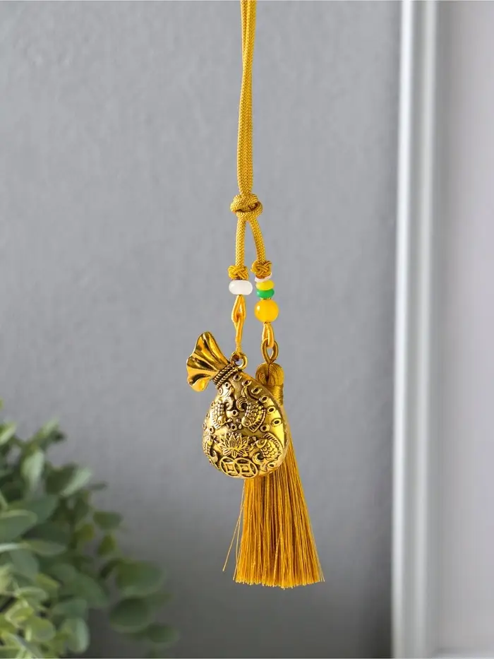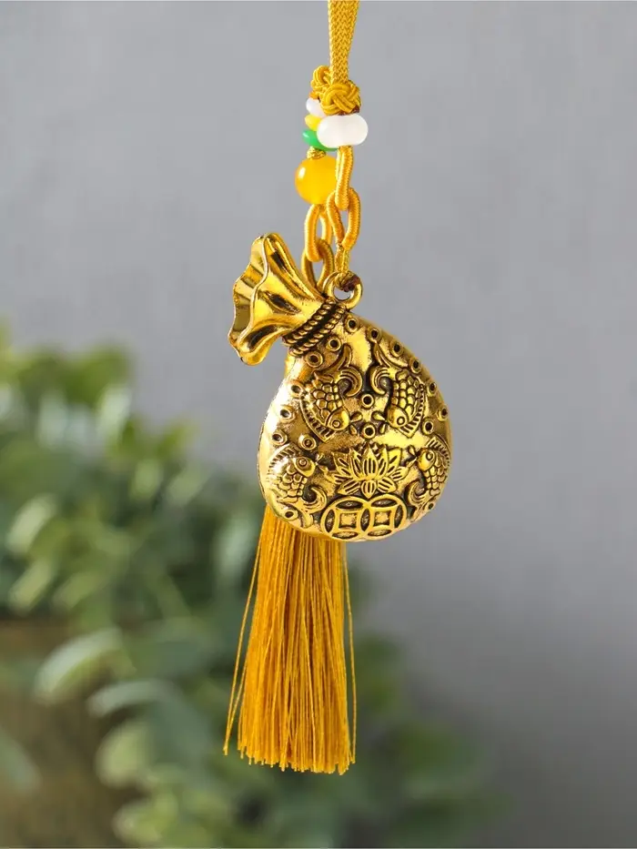 Эта золотистая подвеска — оберег для дома и души. Она соединяет древнюю символику изобилия и чистоты в современном декоративном акценте. Композиция из мешка, рыбок и цветка лотоса на одном подвесе создаёт гармоничный образ, наполненный смыслом. Кисточка внизу добавляет лёгкое движение и завершённость форме.