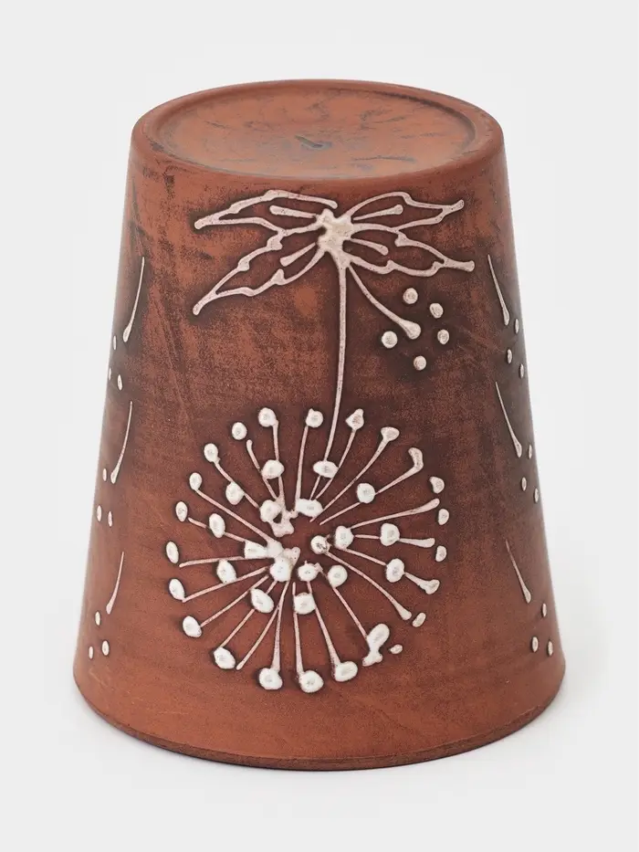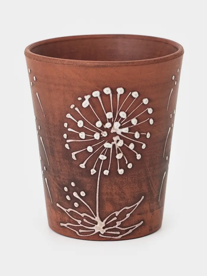Стакан «Одуванчик» из красной глины объемом 400 мл — это гармоничное сочетание натурального материала, удобной формы и выразительного декоративного оформления. Изящный растительный узор придает изделию особый характер, делая его не только практичным, но и эстетически привлекательным элементом сервировки.