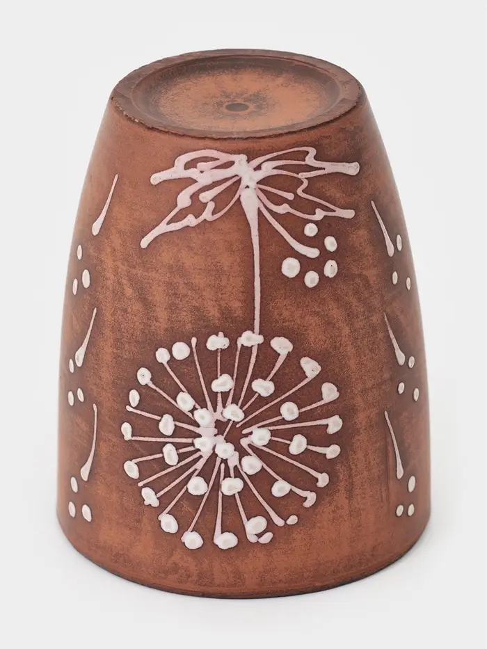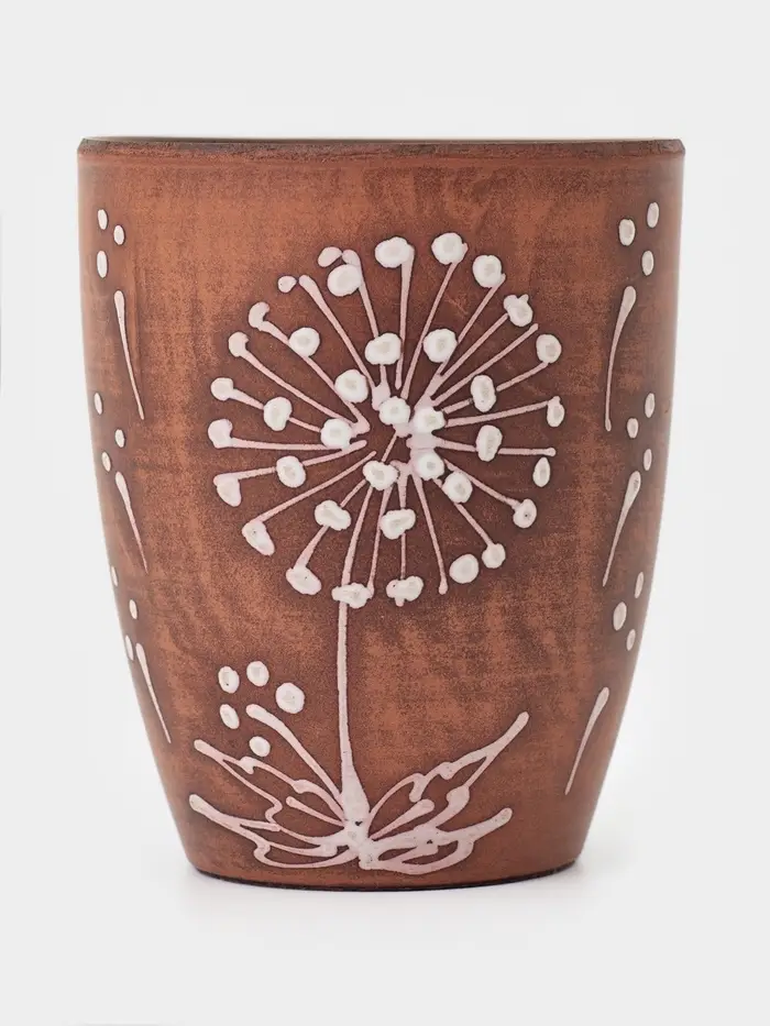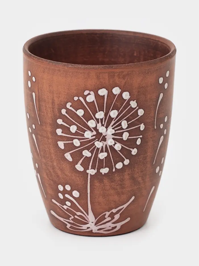 Стакан «Одуванчик» из красной глины — это стильное и атмосферное изделие, сочетающее в себе натуральность материала и изящный декоративный акцент. Растительный узор в виде одуванчика придает стакану особую выразительность, делая его не просто посудой, а частью уютной сервировки.