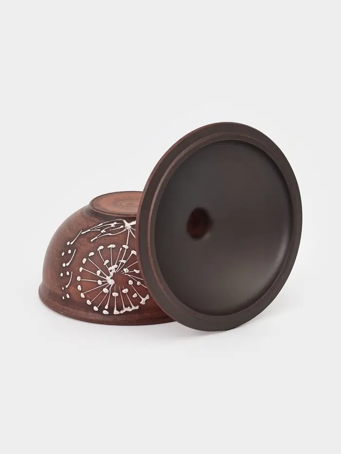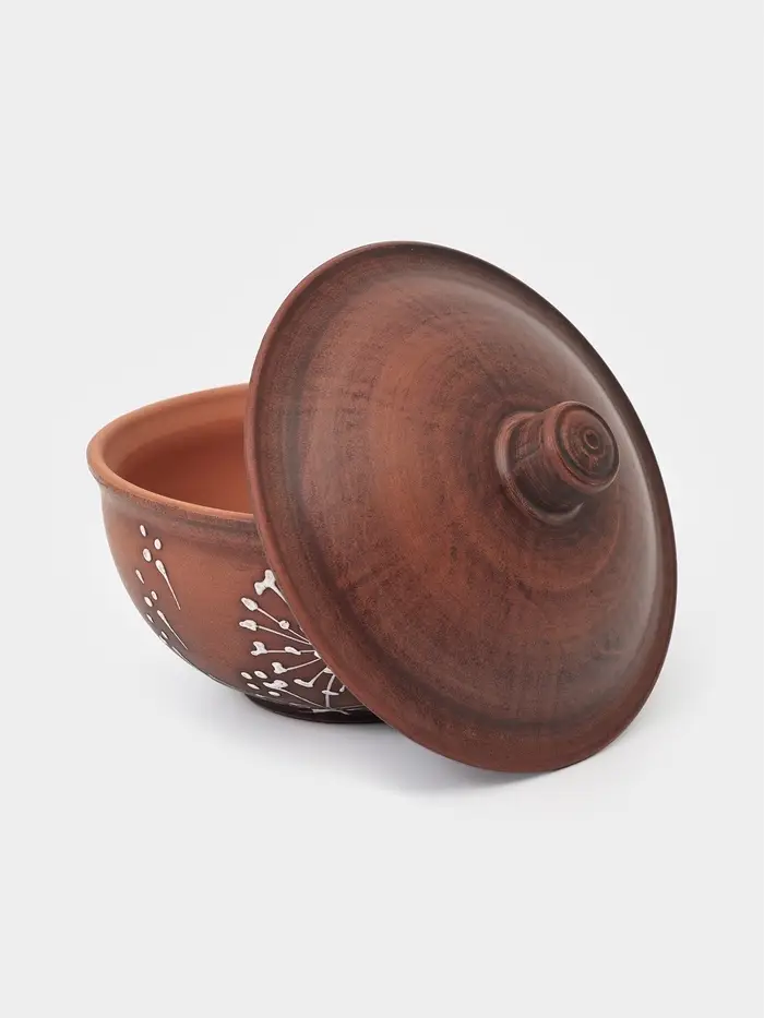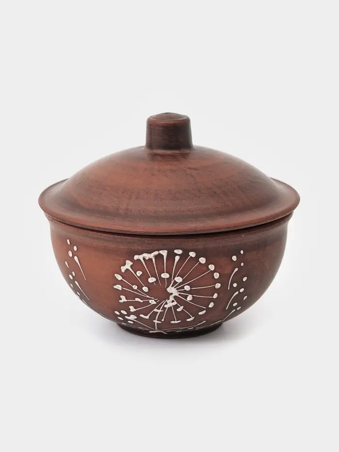 Кокотница изготовлена из натуральной красной глины — экологичного материала, который равномерно распределяет тепло и долго его удерживает. Это позволяет блюдам готовиться мягко и равномерно, сохраняя сочность, аромат и насыщенный вкус. Натуральный коричнево-красный оттенок и декоративный орнамент «одуванчик» создают атмосферу уюта и домашнего тепла.
