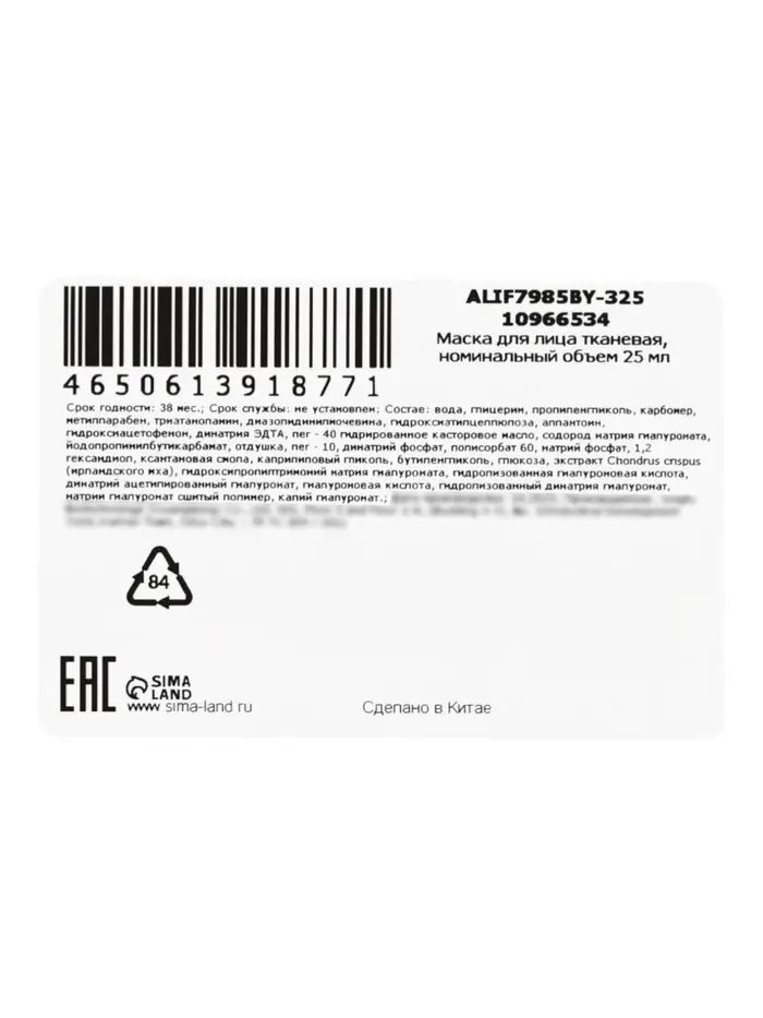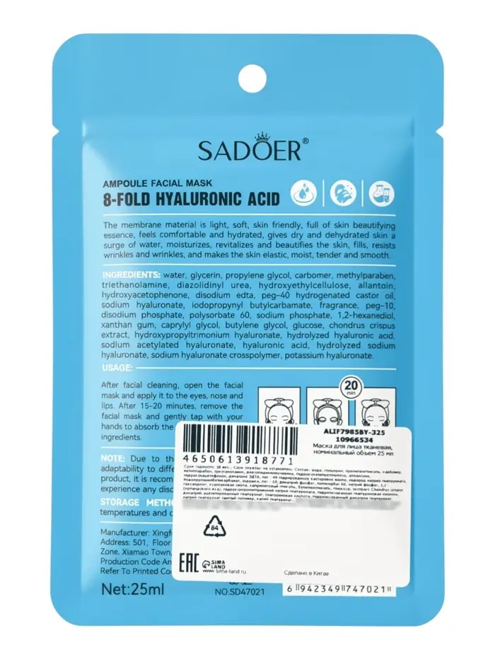 Маска для лица с гиалуроновой кислотой, 25 мл