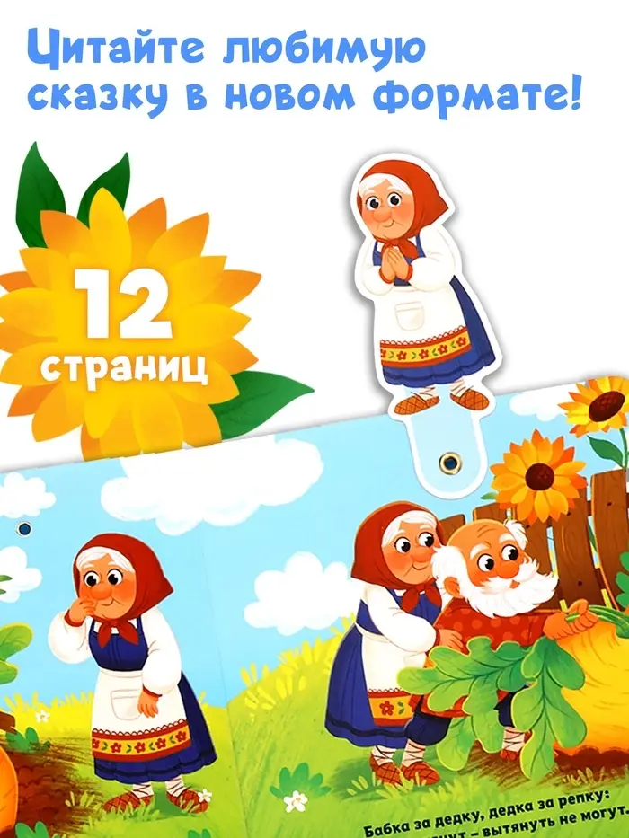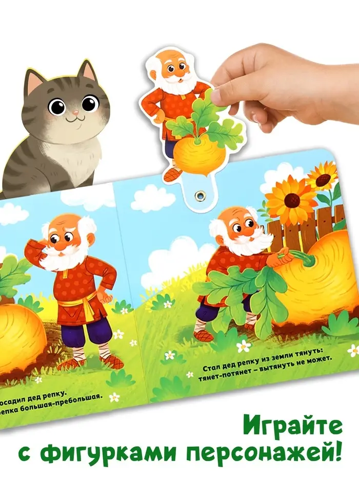 - Яркие персонажи для вовлечения. Дед, бабка, внучка, животные — каждый герой узнаваем и эмоционален. Ребёнок охотнее слушает, когда видит знакомые образы и может показать пальчиком.