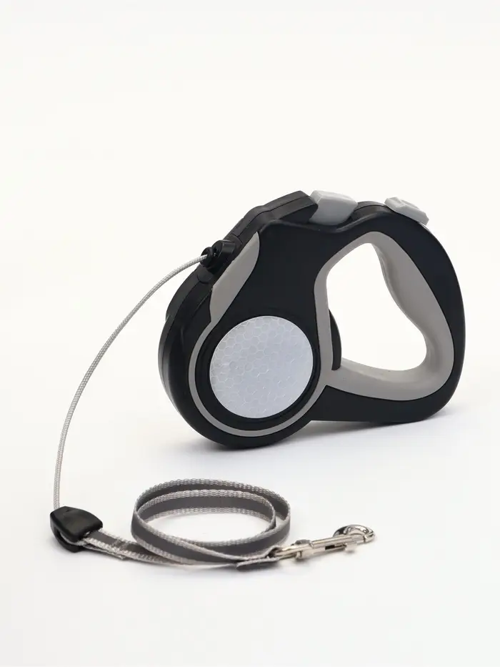 Рулетка — надёжный поводок для прогулок с мелкими и средними собаками до 15 кг. Трос длиной 4 метра даёт питомцу свободу движения, но сохраняет контроль. Серый корпус, прорезиненная ручка и светоотражающие элементы делают модель практичной и безопасной даже в сумерках.