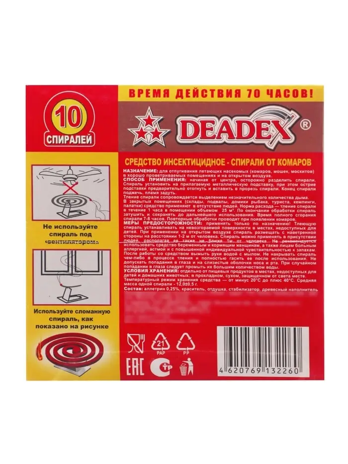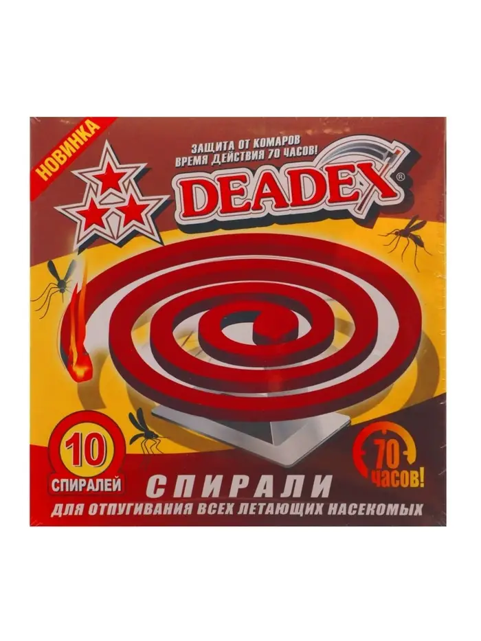 Для комфортного отдыха на природе без насекомых: красные спирали «DEADEX» - это идеальное решение для защиты от комаров, мошек и москитов на открытом воздухе. Берите их с собой на пикник, рыбалку или используйте на даче, чтобы наслаждаться вечерами без назойливого жужжания.