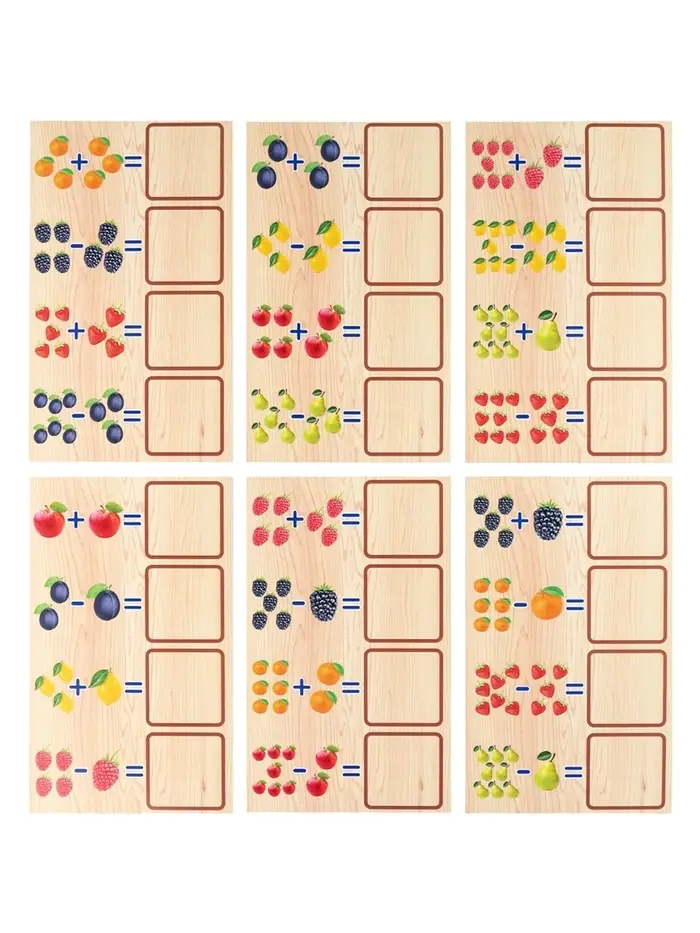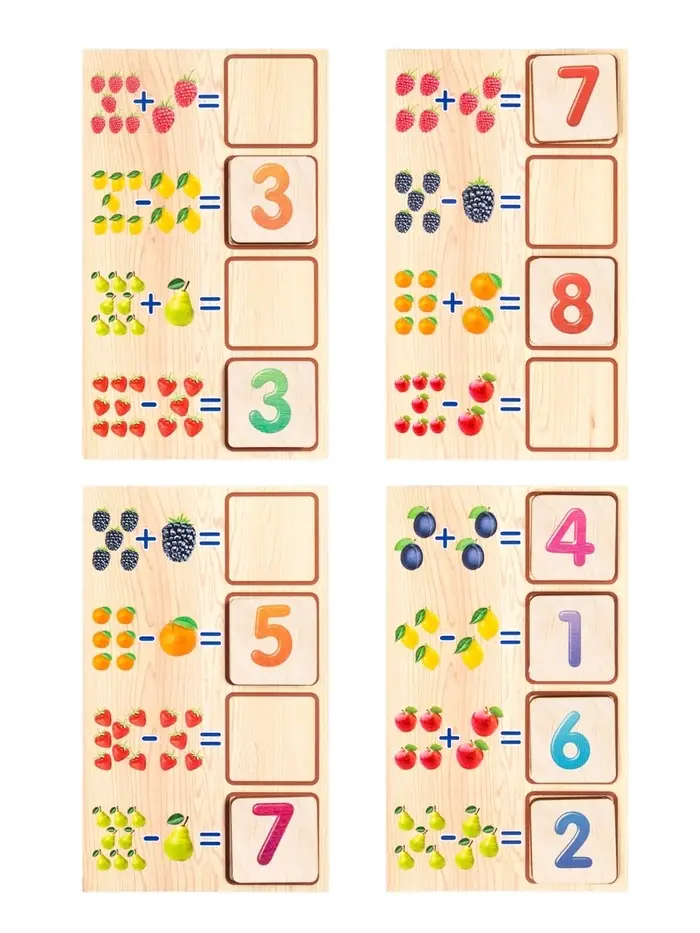 - Индивидуальная игра: разложите все карточки с примерами перед ребёнком. Задача — заполнить свободные окна подходящими цифрами, решая примеры или пересчитывая изображённые ягоды.
