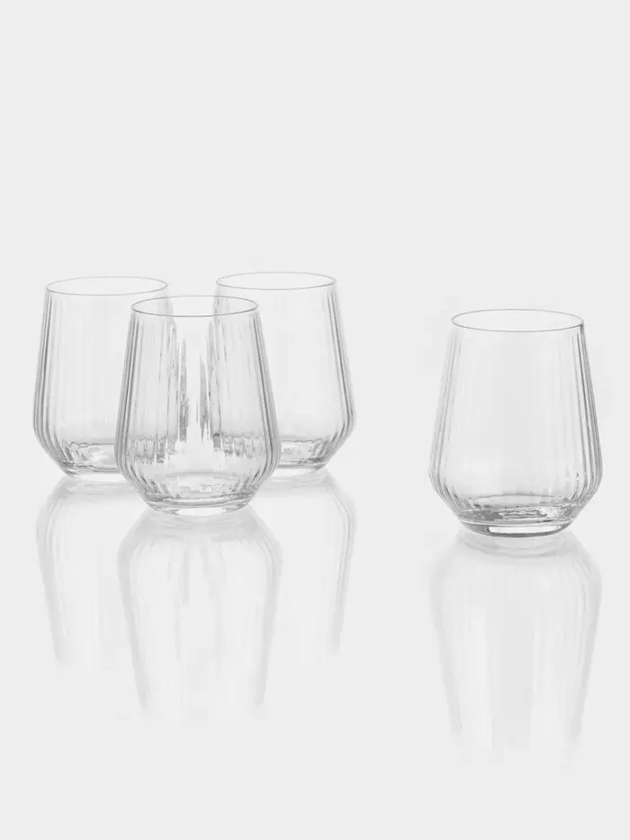 Эти четыре прозрачных стакана — универсальная основа для сервировки. Их рельефная текстура не только приятно ложится в ладонь, но и надёжно удерживает бокал, даже если поверхность влажная. Классическая форма и чистое стекло делают их уместными для любого напитка — от свежего сока за завтраком до вечернего коктейля.