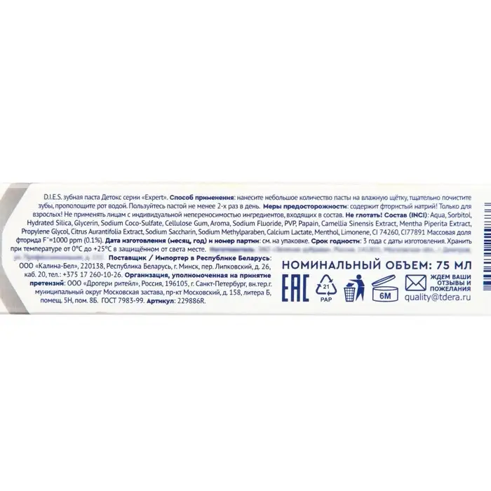 Зубная паста D.I.E.S. "Детокс", 75 мл