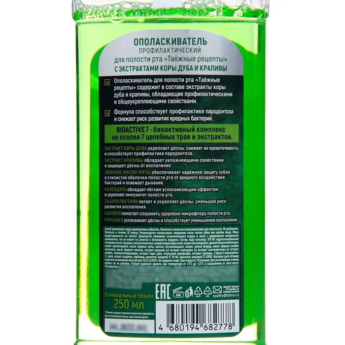 Ополаскиватель для рта Таёжные рецепты "Экстракт коры дуба и крапивы", 250 мл