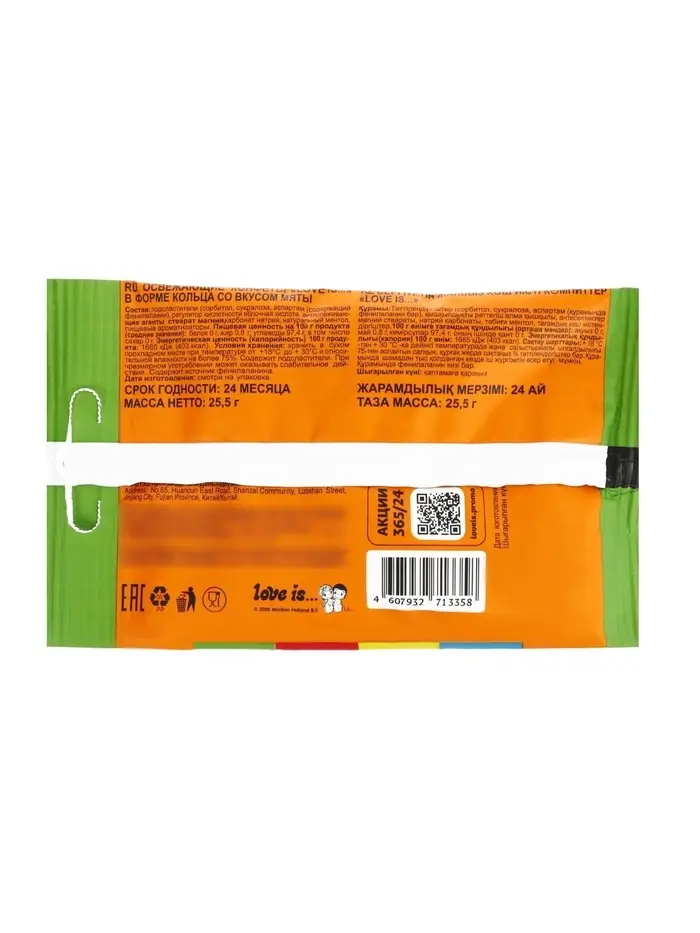 Как использовать: Положите несколько колец в коробочку для сладостей, добавьте к чайному подарку, используйте для украшения капкейков или просто носите с собой для свежести. Одна упаковка мятных конфет-колец LOVE IS превращает обычный презент в тематический (свадьба, день влюблённых) или просто радует освежающим вкусом.