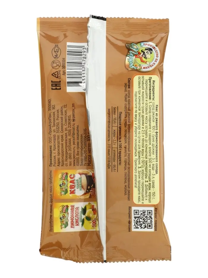 - Солод красный ржаной 100 г: Веса хватает на 5-7 литров кваса или на 3-4 литра домашнего пива. В выпечку добавляют 1-2 столовые ложки на буханку хлеба.
