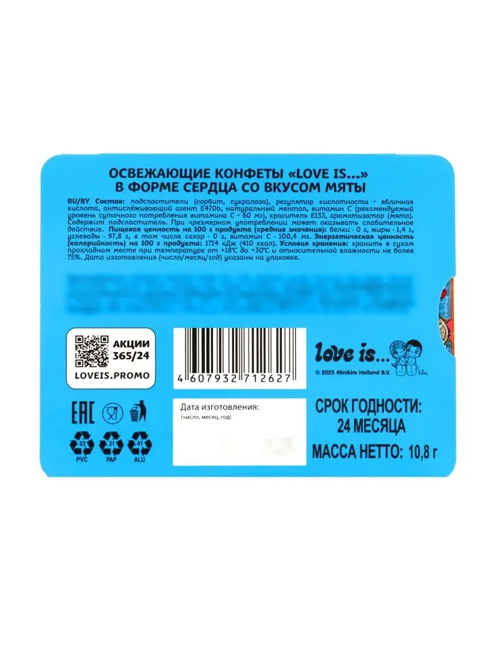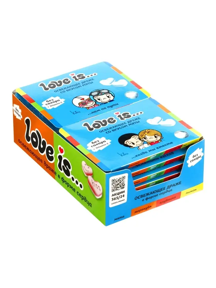 Мятные конфеты-сердца LOVE IS… (10.8 г, в блистере с обечайкой) – освежающие драже в форме сердечек. Упаковка в виде блистера с картонной обечайкой – готовый мини-подарок на 14 февраля и другие романтические поводы.