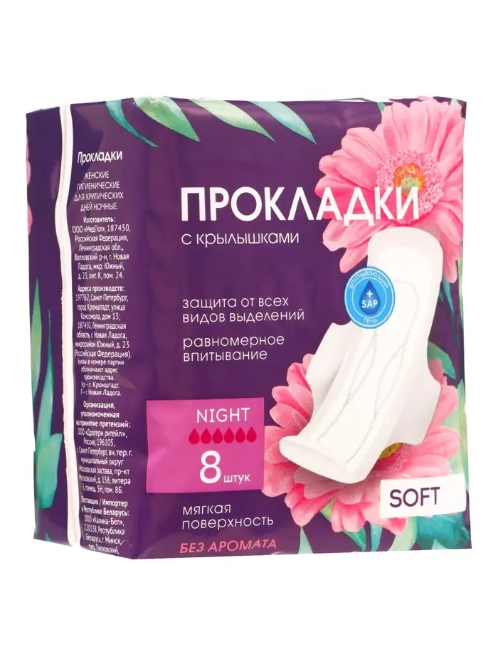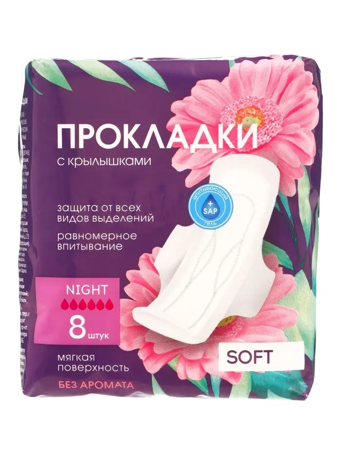 Прокладки с крылышками «Ночные» Софт, 8 шт.