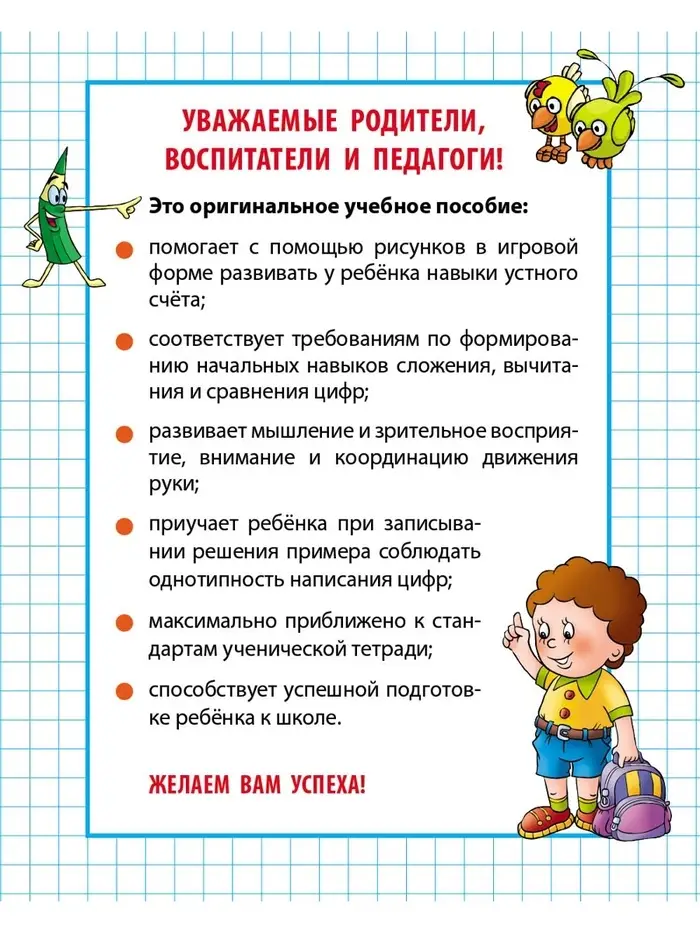 - Подготовка к школе в удовольствие. Пособие формирует базовые навыки счёта и письма до первого класса. Ребёнок приходит на урок с уверенностью и интересом к учёбе.
