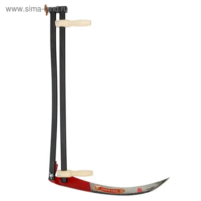 - Складное косовище из металлической профилированной трубы с двумя деревянными рукоятками. Оно эргономично изогнуто. Его можно отрегулировать по высоте под свой рост. На конце есть отверстие под монтажный болт для надёжной фиксации полотна.