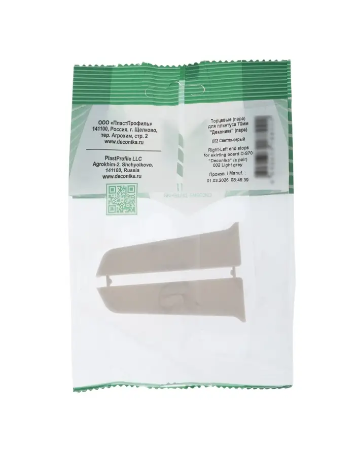 Высота 70 мм соответствует стандартным плинтусам серии «Деконика». Цвет 002 светло-серый полностью совпадает с плинтусом, благодаря чему заглушки не выделяются и сохраняют единый внешний вид интерьера.