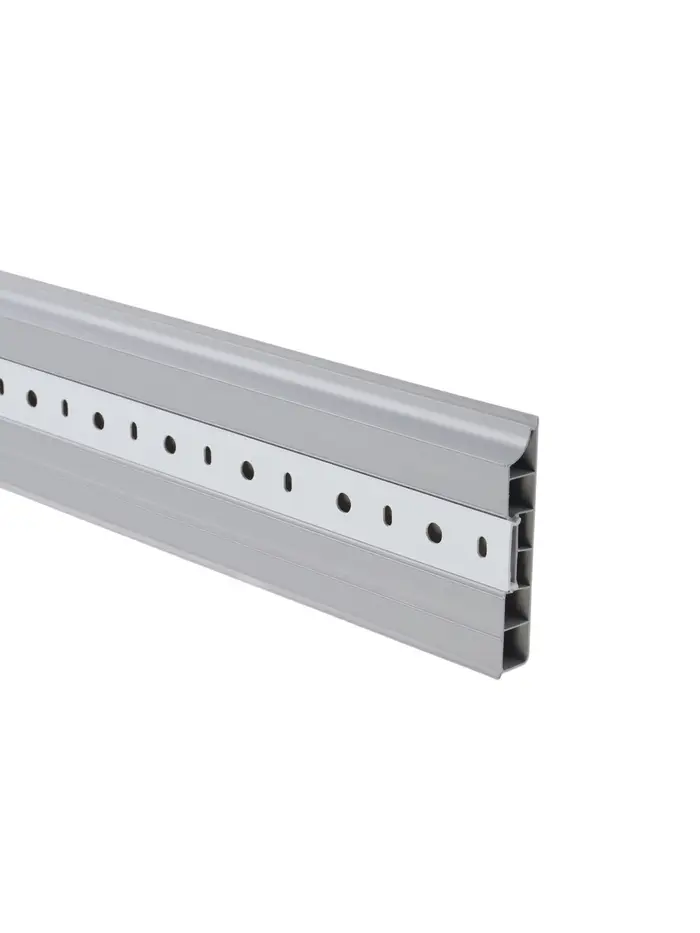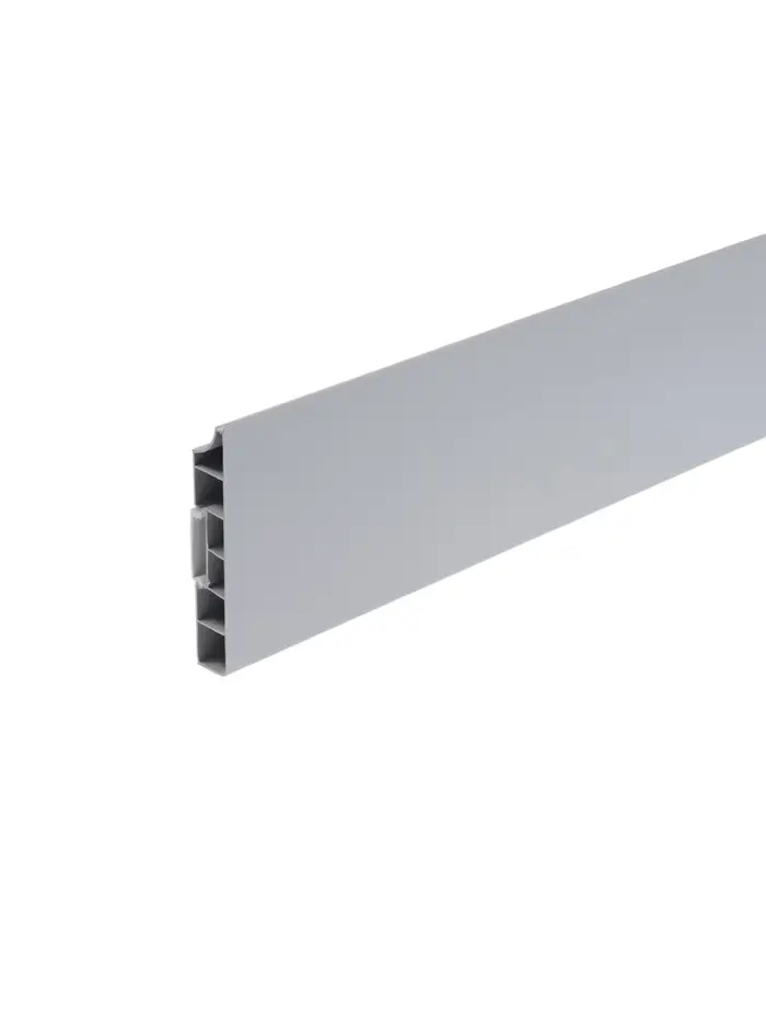 Плинтус изготовлен из ПВХ — материала, устойчивого к влаге, износу и механическим воздействиям, что обеспечивает стабильность при ежедневной эксплуатации. Конструкция с внутренними ребрами жесткости и плотным прилеганием к стене и полу позволяет скрыть неровности и повысить качество отделки.