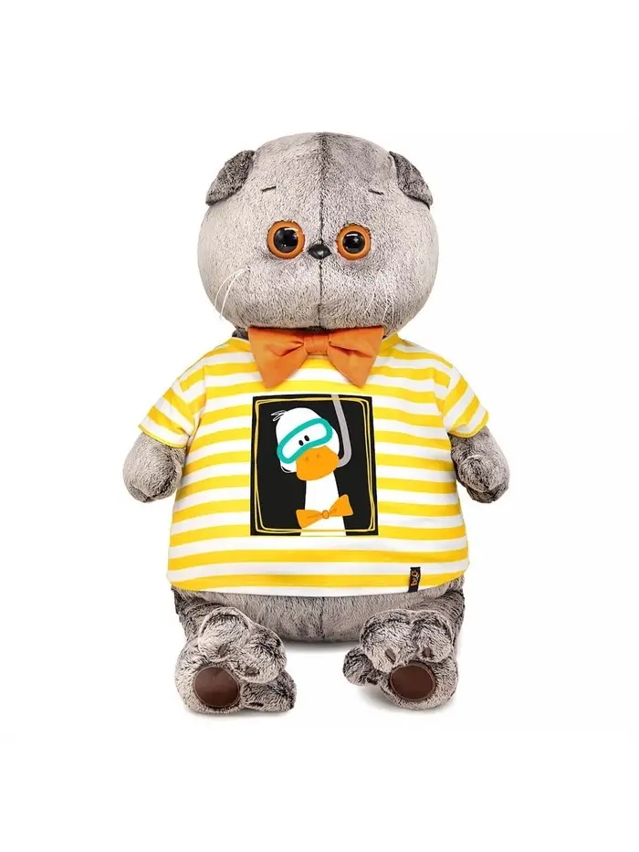 Мягкая игрушка «Кот Басик в футболке „Гусик в маске для плавания“» — яркий и забавный герой, который заряжает позитивом. В жёлто-белой футболке с принтом и оранжевым бантом Басик выглядит по-летнему стильно и добавляет хорошего настроения в любой день.