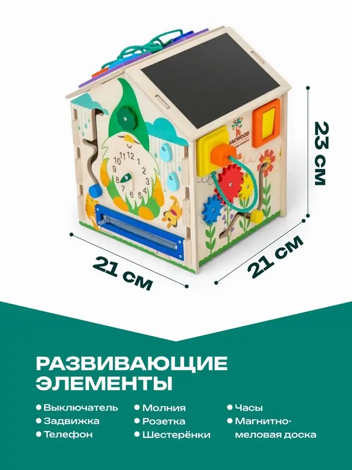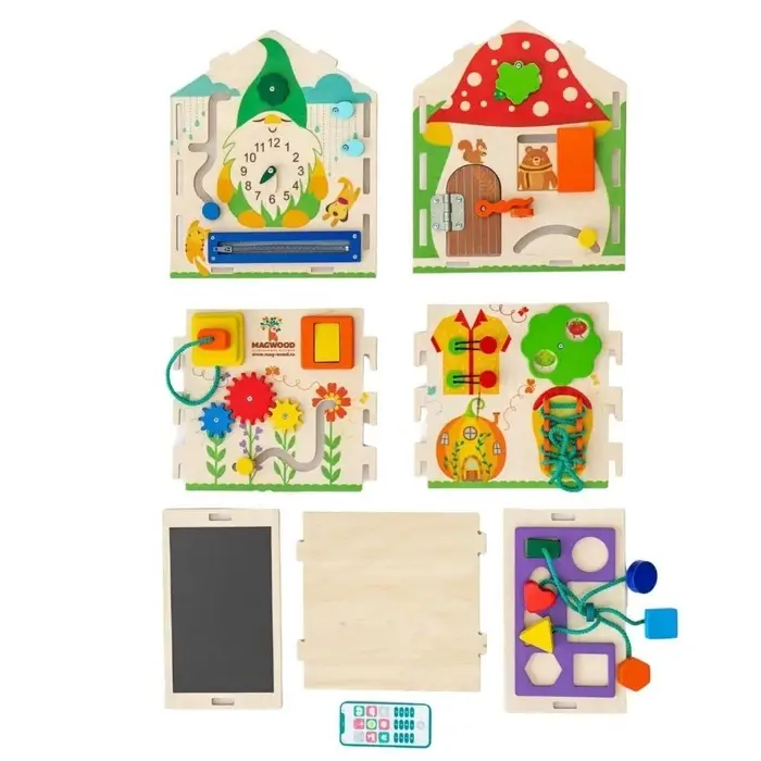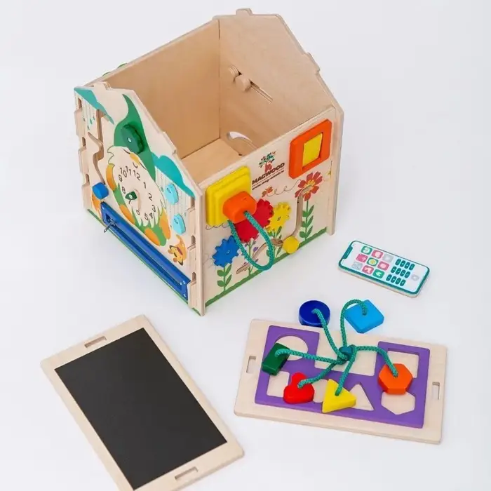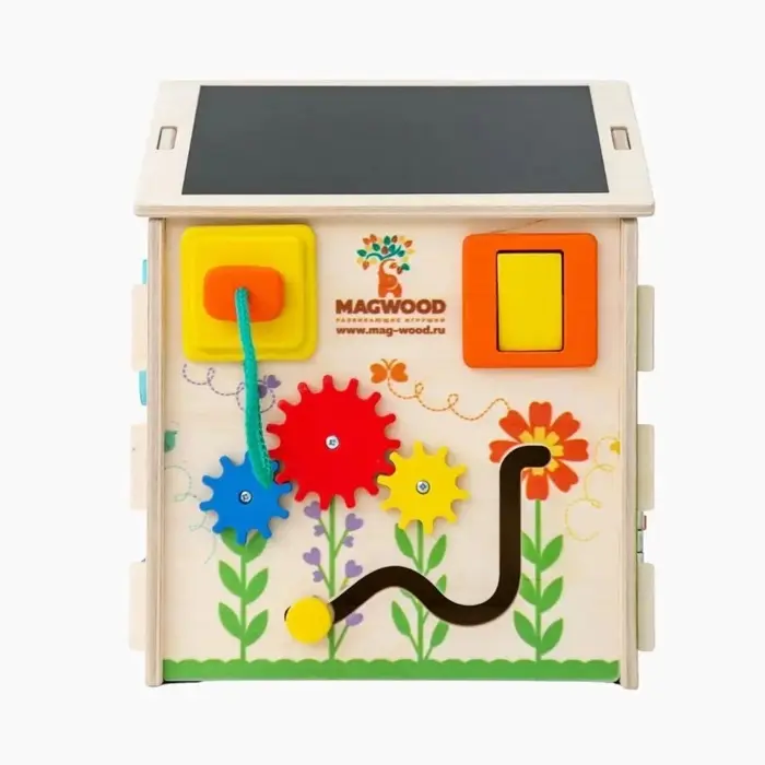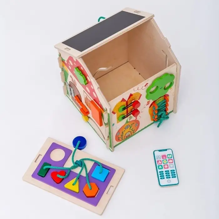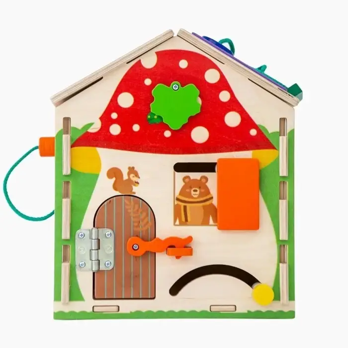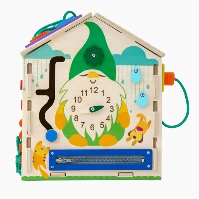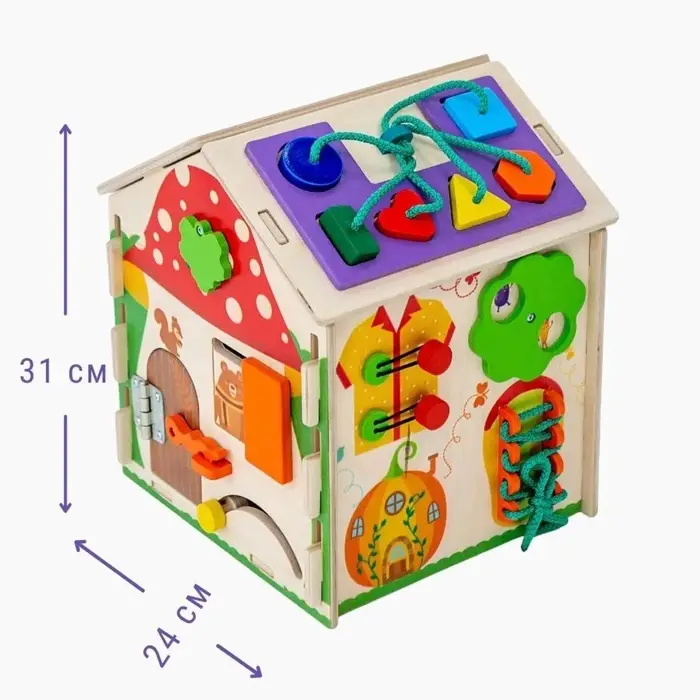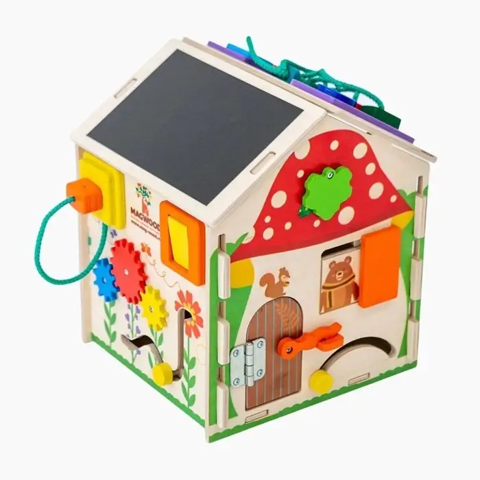 На сторонах домика размещены различные игровые элементы: замочки, вращающиеся детали, шестерёнки, лабиринты и другие механизмы. Во время игры ребёнок тренирует мелкую моторику, учится понимать причинно-следственные связи и развивает воображение. Такой развивающий домик подходит для детей от 3 лет и станет интересным занятием дома.