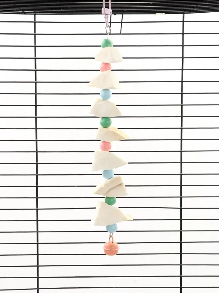Игрушка с панцирем каракатицы и бусами — тройная польза для попугая: точка для стачивания клюва, источник кальция и развлечение. Подвеска длиной 15 см включает натуральный панцирь каракатицы, яркие бусины и колокольчик, который привлекает внимание звоном.