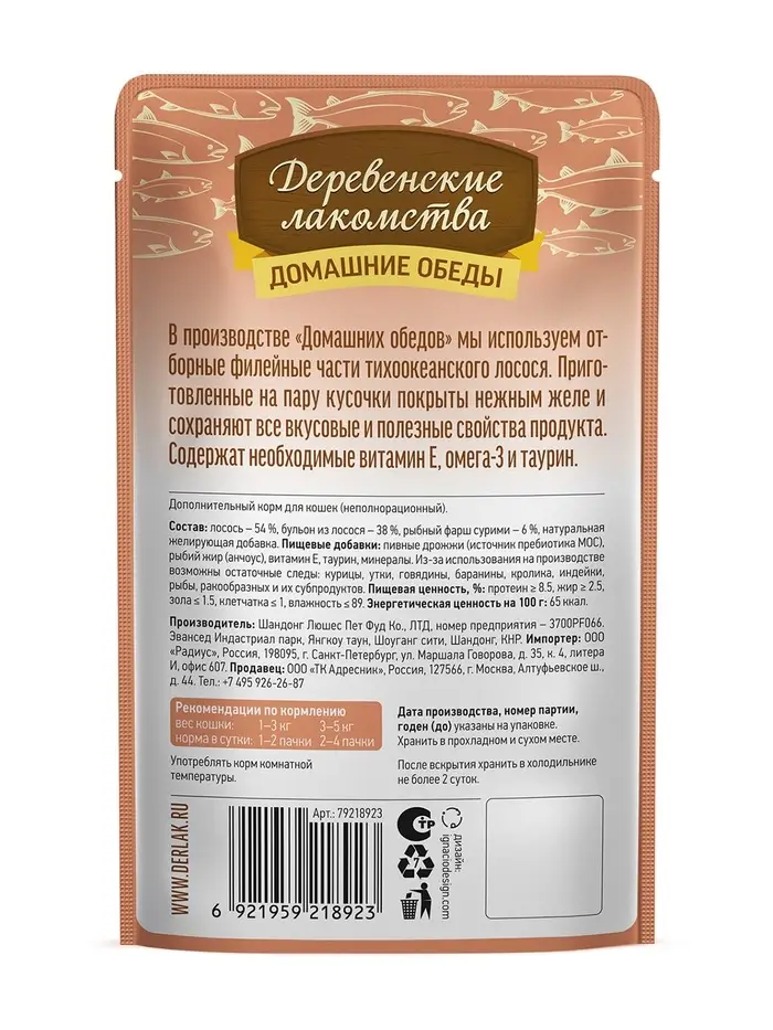 Влажный корм для кошек «Деревенские лакомства», лосось с крабом в нежном желе, пауч, 70 г