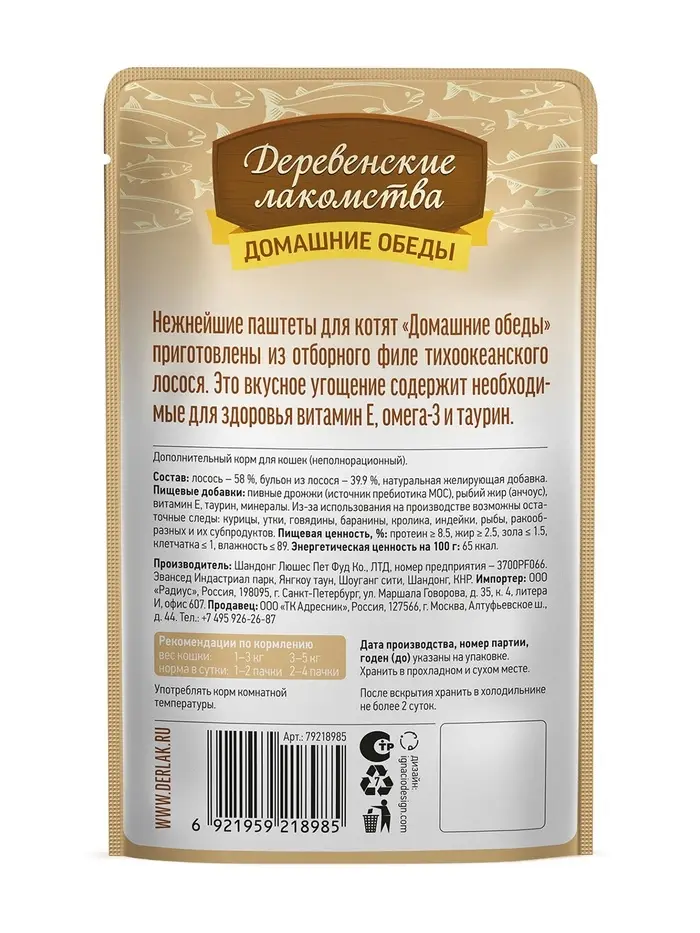 Консервированный влажный корм для котят серии «Деревенские лакомства — Домашние обеды» из отборного лосося. Для этого деликатеса мы отобрали только свежайший лосось, богатый витаминами и омега-3 жирными кислотами, столь необходимыми для роста и развития котенка. Мягкая текстура паштета идеально подходит для нежных зубок маленьких котят.