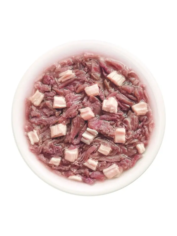Состав: утка 54 %, кролик 6 %, бульон из утки 38 %, натуральная желирующая добавка.