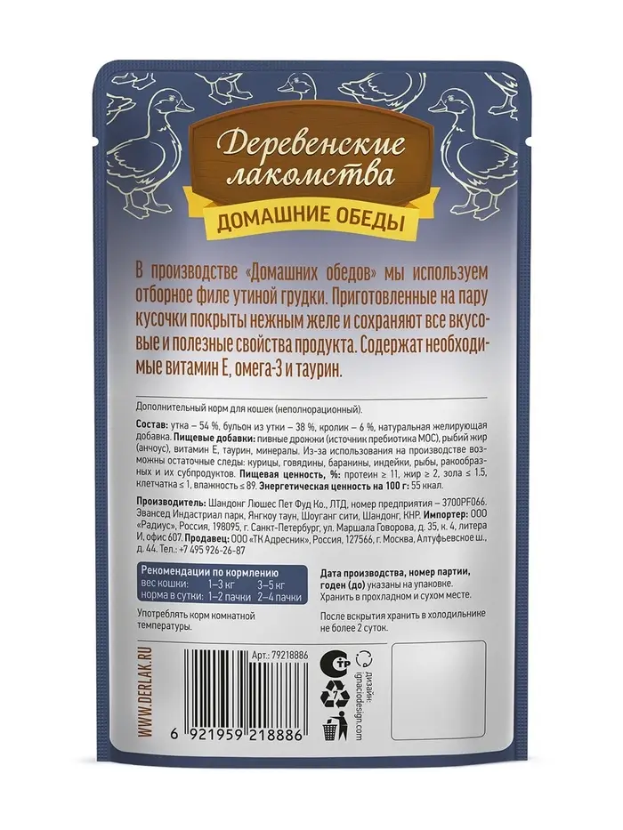 Консервированный влажный корм для кошек серии «Деревенские лакомства — Домашние обеды» — это изысканное угощение. В нем тщательно отобранные кусочки утиной грудки превосходно сочетаются с легкоусвояемым мясом кролика, формируя уникальную комбинацию, которая придется по вкусу всем, кто заботится о здоровом рационе.