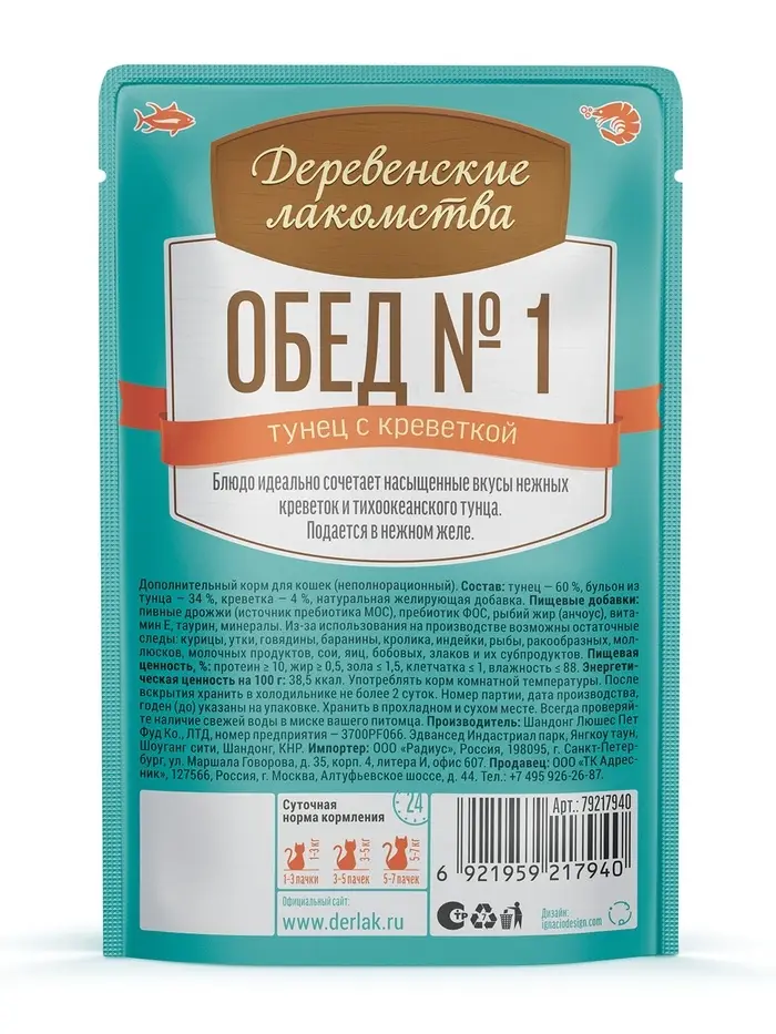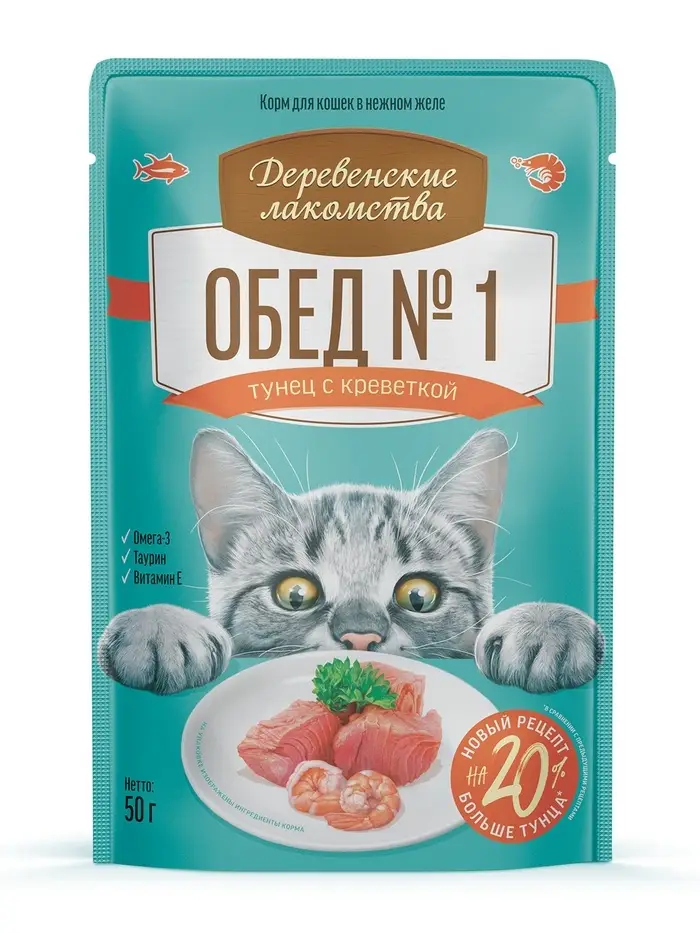 Влажный корм для кошек «Деревенские Лакомства», тунец с креветкой, пауч, 50 г