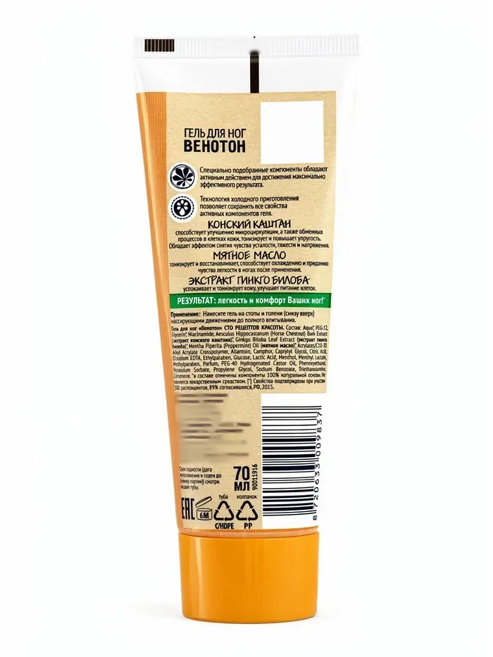Ощущайте только легкость и комфорт ваших ног с активным гелем Венотон. Конский каштан в его составе способствует укреплению стенок кровеносных сосудов, улучшает обменные процессы в клетках кожи, тонизирует и снимает отечность. Мятное масло тонизирует и восстанавливает, способствует охлаждению и приданию чувства легкости в ногах после применения. Экстракт гинкго билоба успокаивает и тонизирует кожу, уменьшает отечность. Не является лекарственным средством.