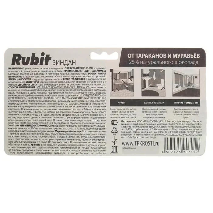 Гель-приманка от тараканов и муравьев «РУБИТ Зиндан Люкс» (30 г)Гель «РУБИТ Зиндан Люкс» является эффективной приманкой в виде геля для уничтожения тараканов и муравьев, съедая которую насекомые гибнут сами и смертельно заражают сородичей. Очень привлекателен для насекомых, благодаря высокому содержанию натурального меда и шоколада.Область применения и способ использованияГибель насекомых наступает уже через 2-3 часа после контакта с гелем. 30 грамм геля рассчитано на обработку помещения площадью 30-40 м².Действующее вещество: имидаклоприд 0,5%, хлорпирифос 0,25%.