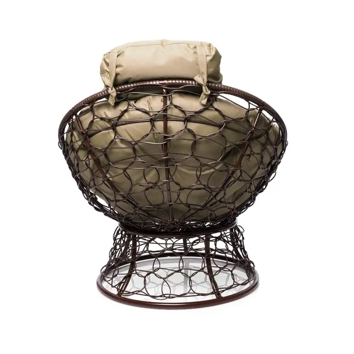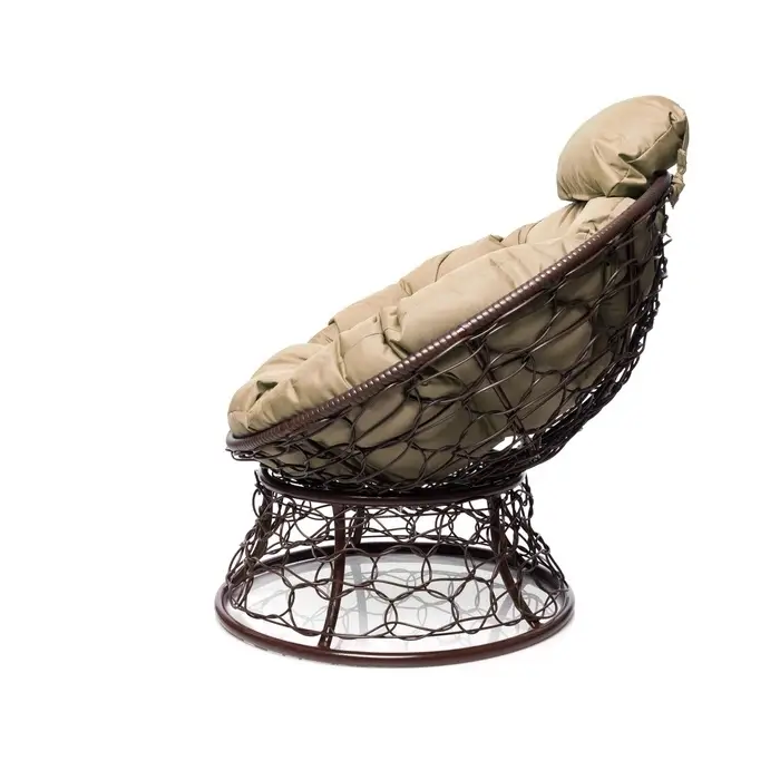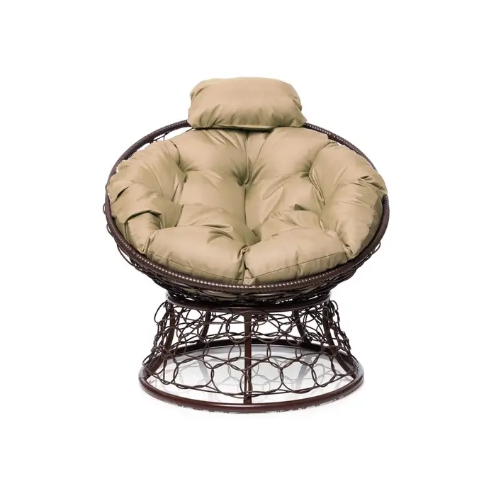Кресло «Папасан» с искусственным ротангом на прочном коричневом каркасе. Комплектуется мягкой бежевой подушкой из износостойкого текстиля. Оптимальные габариты 98×90×95 см позволяют разместить в любом интерьере. Металлическая основа выдерживает до 100 кг.