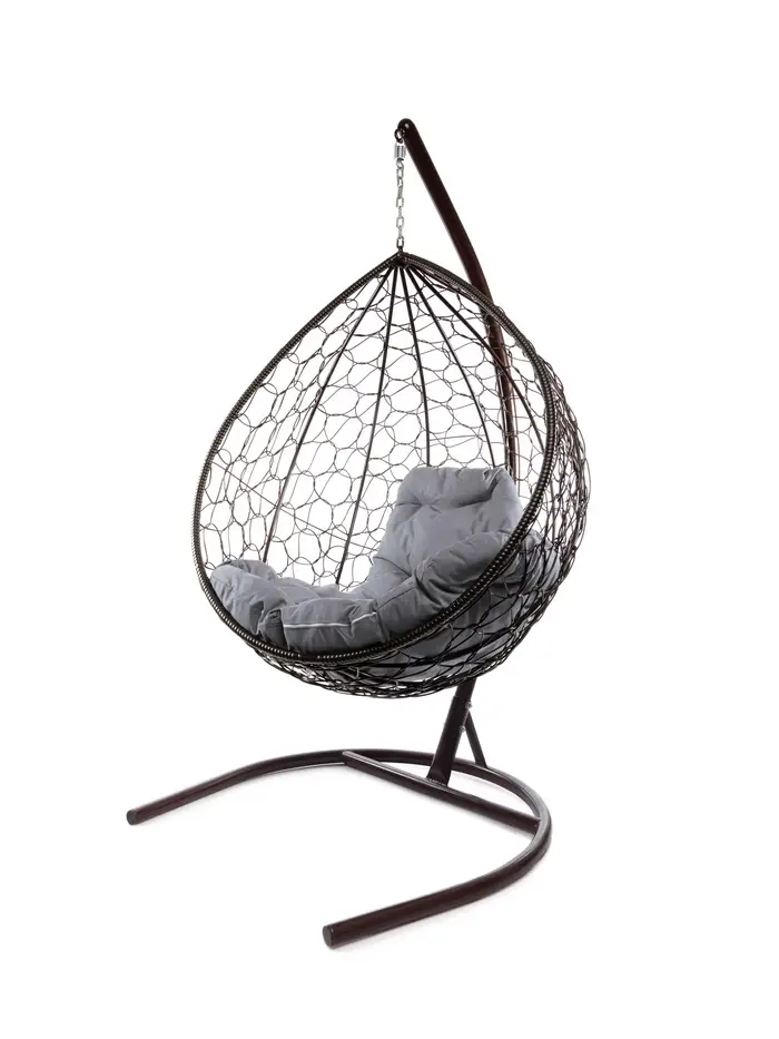 Подвесное кресло-кокон коричневого цвета с серой подушкой — удобное место для отдыха дома и на улице. Плавная форма и мягкая подушка создают комфортное пространство для расслабления, а прочный металлический каркас выдерживает нагрузку до 120 кг.