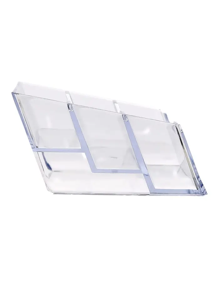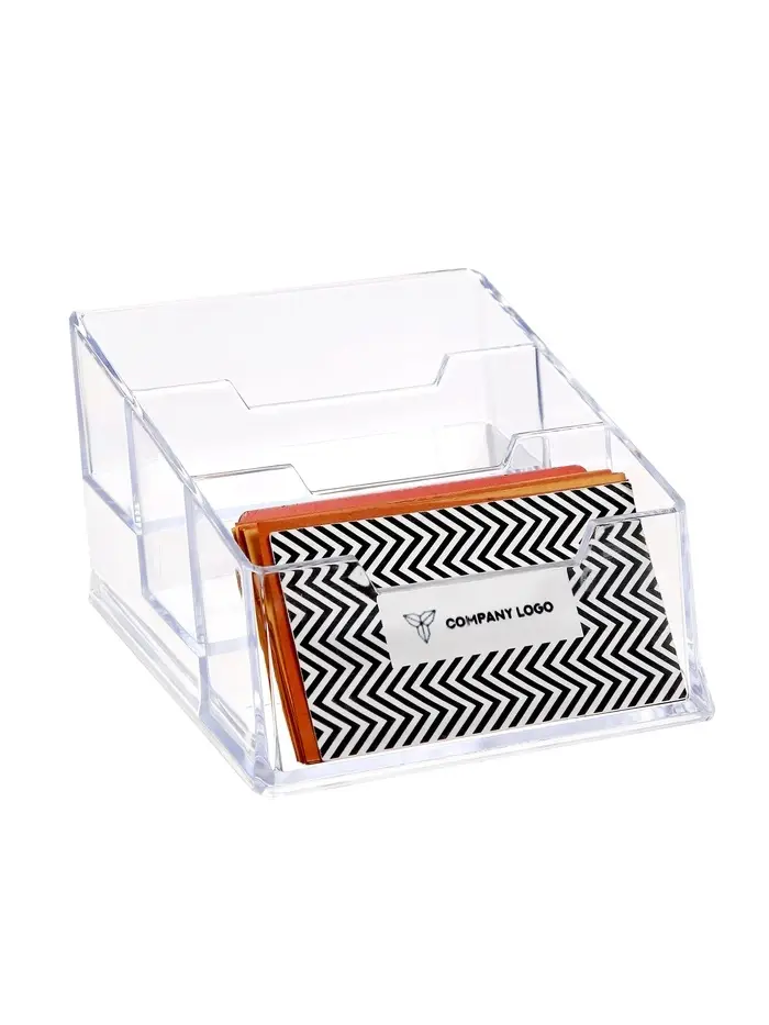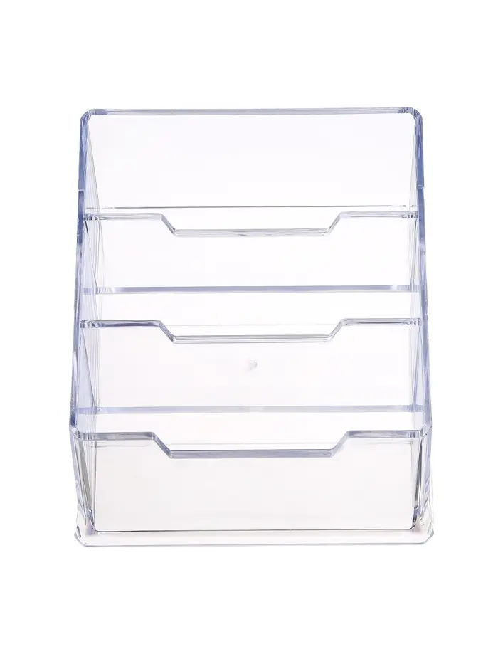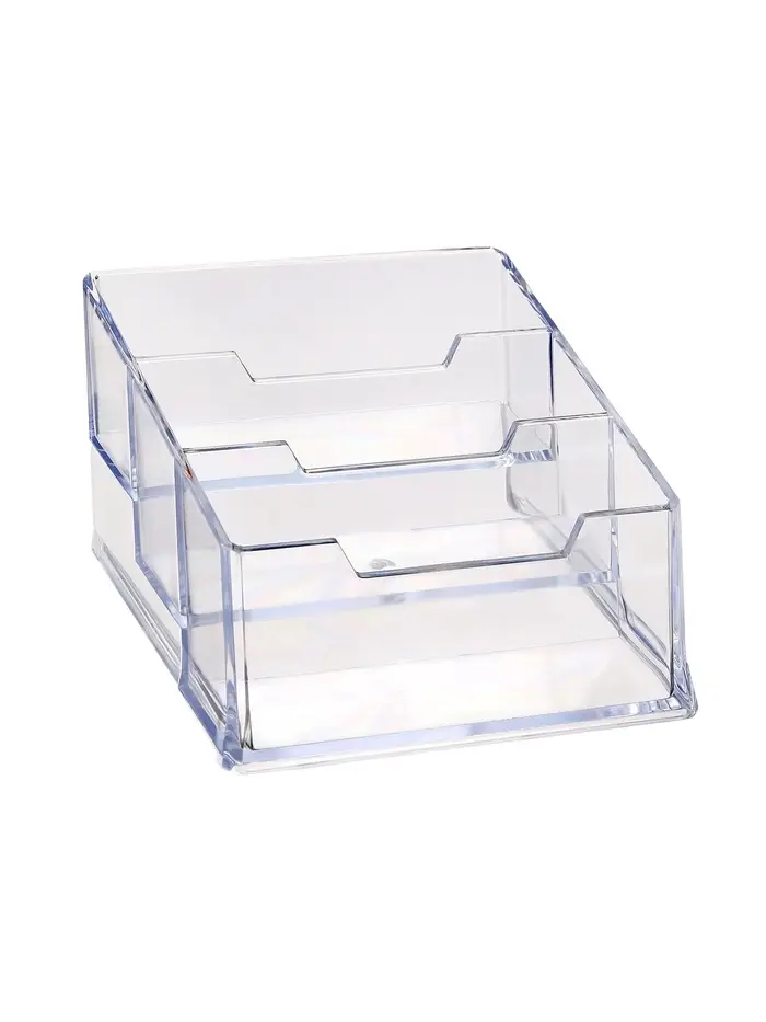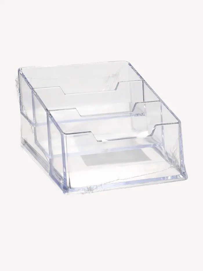 Прозрачная подставка для визиток с тремя отделениями — удобное и функциональное решение для аккуратного хранения и демонстрации визитных карточек в офисе, на ресепшене или в торговых точках. Конструкция с тремя секциями, расположенными каскадом, позволяет удобно распределять визитки по категориям, сотрудникам или направлениям деятельности, обеспечивая быстрый доступ и наглядность для клиентов. Изделие выполнено из прочного пластика или полистирола, что гарантирует легкость, устойчивость к повреждениям и длительный срок службы при ежедневной эксплуатации. Прозрачный материал не отвлекает внимание от содержимого и позволяет полностью видеть размещенные визитки, повышая эффективность их презентации. Компактные размеры позволяют разместить подставку даже на небольшом рабочем столе, при этом она сохраняет устойчивость и аккуратный внешний вид. Простая форма и универсальный дизайн гармонично вписываются в любой интерьер — от делового офиса до выставочного стенда. Подставка помогает поддерживать порядок, упрощает взаимодействие с клиентами и делает размещение визитных карточек более организованным и удобным.