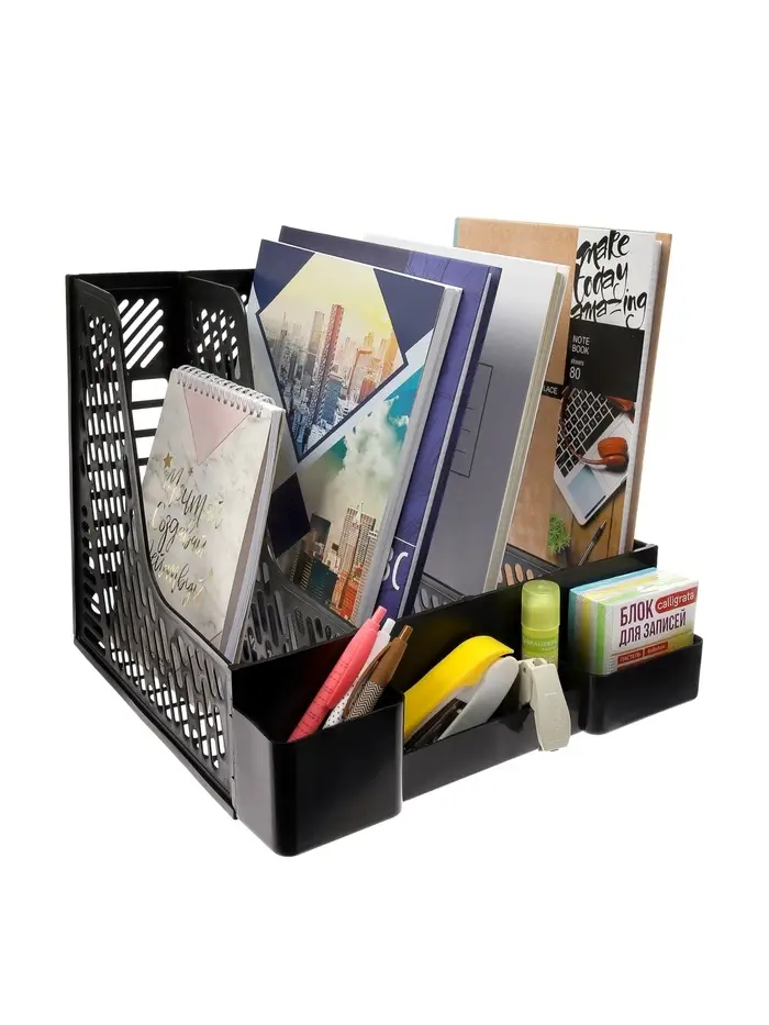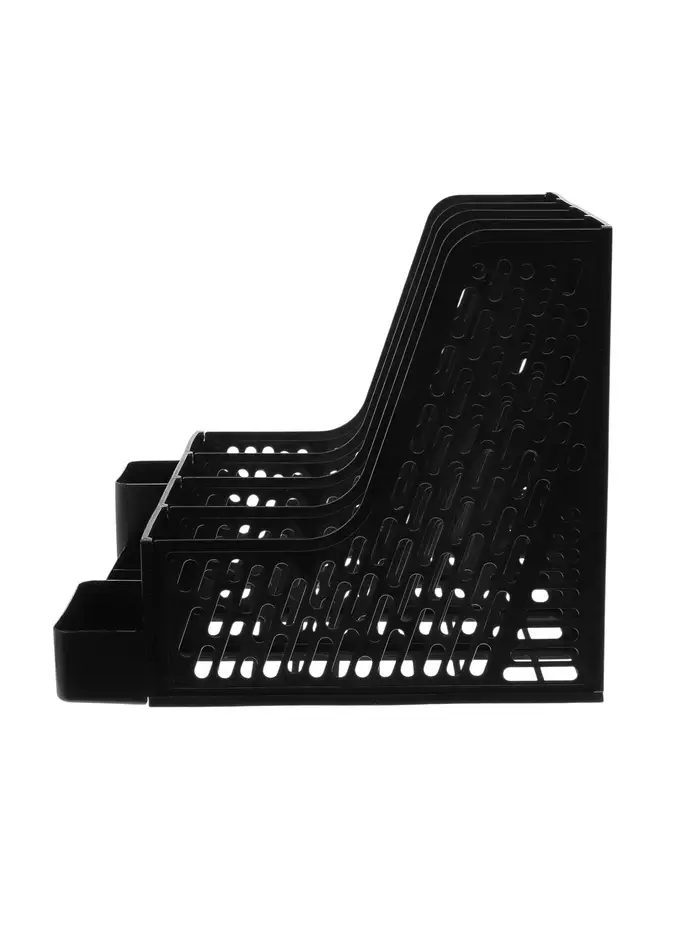 Вертикальный лоток для бумаг Calligrata — удобное и практичное решение для организации рабочего пространства дома или в офисе. Модель оснащена четырьмя отделениями, которые позволяют аккуратно распределять документы, папки, тетради и журналы по категориям, обеспечивая быстрый доступ к необходимым материалам. Дополнительные секции для пишущих принадлежностей делают конструкцию еще более функциональной, позволяя хранить ручки, карандаши и другие канцелярские мелочи в одном месте. Вертикальный формат помогает экономить место на рабочем столе и поддерживать порядок даже при большом количестве документов. Лоток выполнен из прочного пластика, устойчивого к ежедневной эксплуатации, что гарантирует долговечность и надежность использования. Черный цвет придает изделию универсальный и строгий внешний вид, благодаря чему оно гармонично вписывается в любой интерьер — от домашнего кабинета до офисного пространства. Конструкция проста в использовании и не требует сложного ухода, сохраняя аккуратный вид в течение длительного времени.
