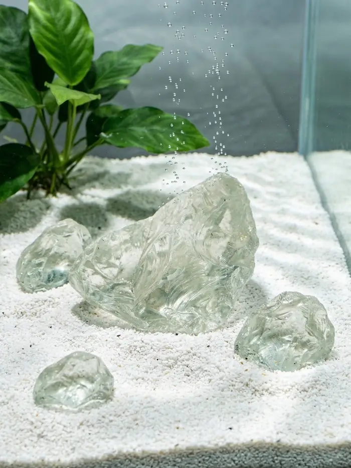 Декоративные прозрачные камни — лаконичный и безопасный элемент оформления аквариума. Стеклянные камушки фракцией 3–5 см имитируют натуральные камни, но не влияет на химический состав воды. Прозрачная текстура создаёт эффект чистоты и глубины, не отвлекая от поведения рыб и роста растений.
