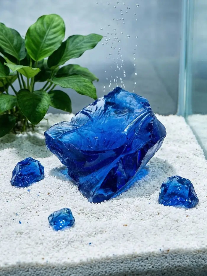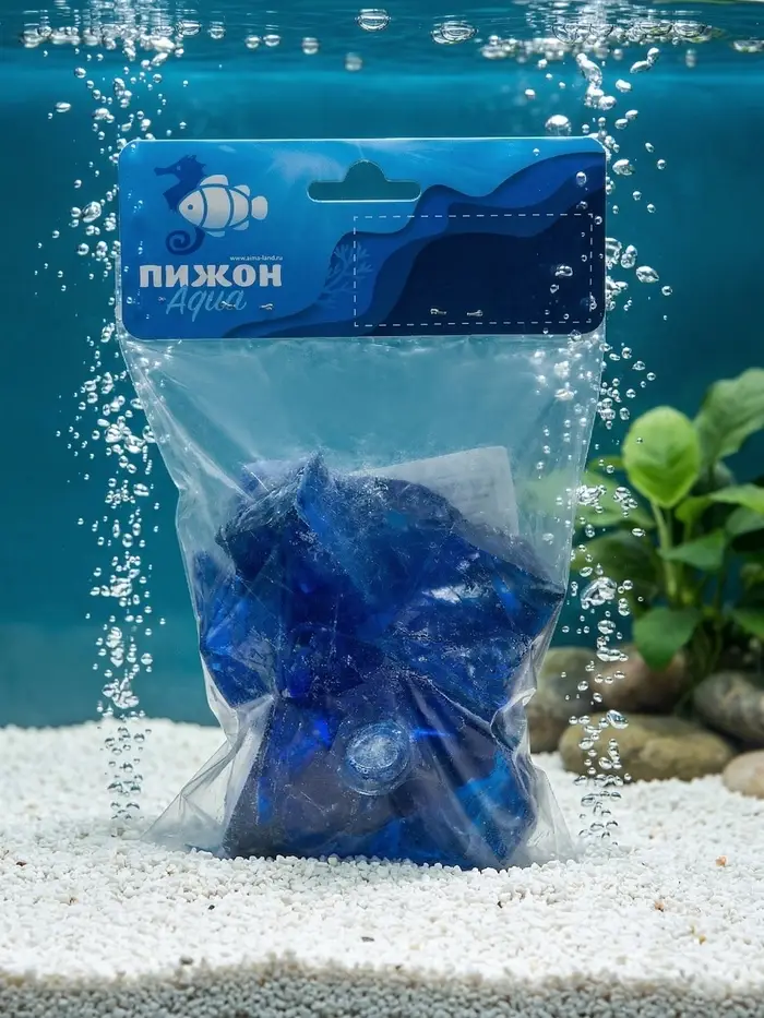 Декоративные синие камни — яркий и безопасный акцент для аквариума. Стеклянные камушки фракцией 3–5 см не влияют на параметры воды, но добавляет визуальной глубины и контраста. Синий оттенок оживляет композицию, подчёркивает движения рыб и гармонично сочетается с растениями и корягами.