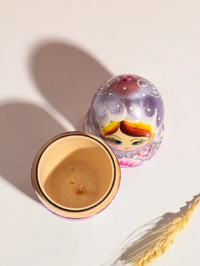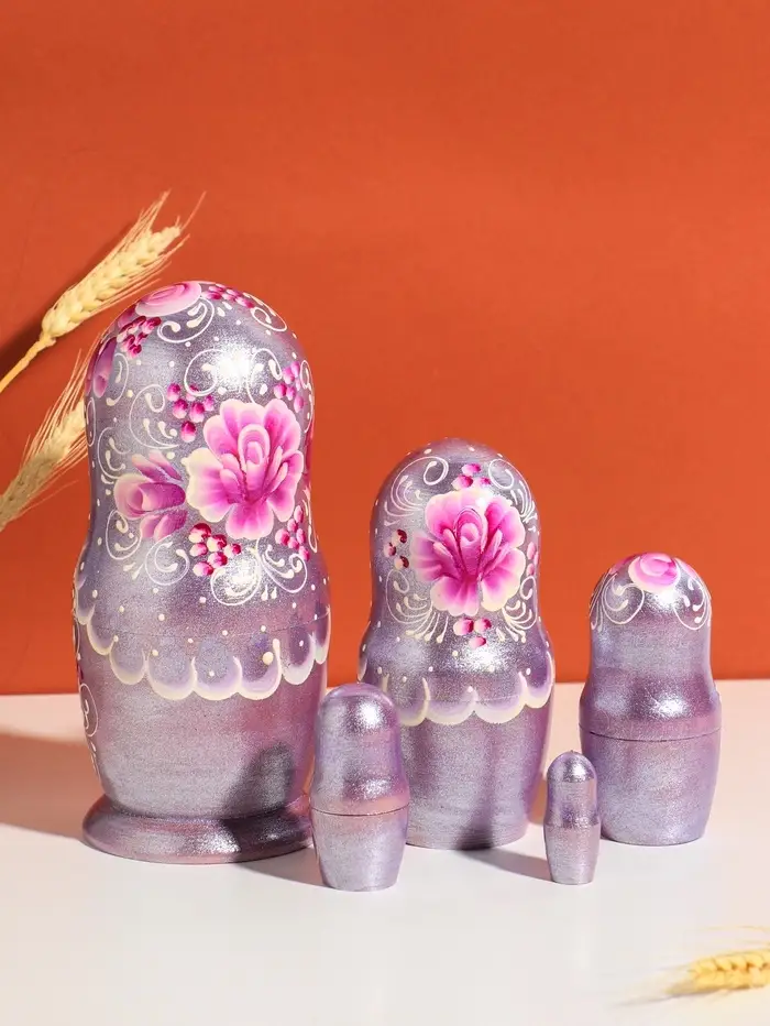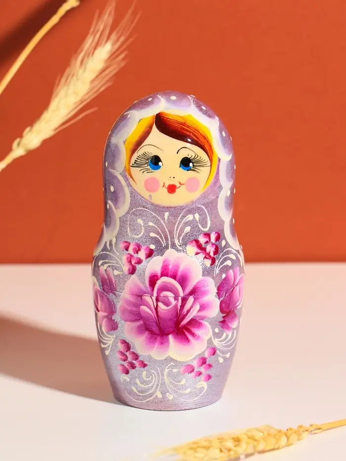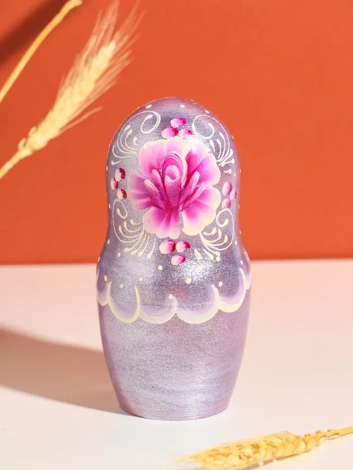 Эта пятиместная матрёшка в классической форме — готовый подарок, который хранит тепло рук мастера. Её сиреневый цвет и тонкая художественная роспись создают ощущение нежного летнего рассвета. Игрушка становится первым произведением искусства в коллекции ребёнка, знакомя с традициями через игру и красоту.