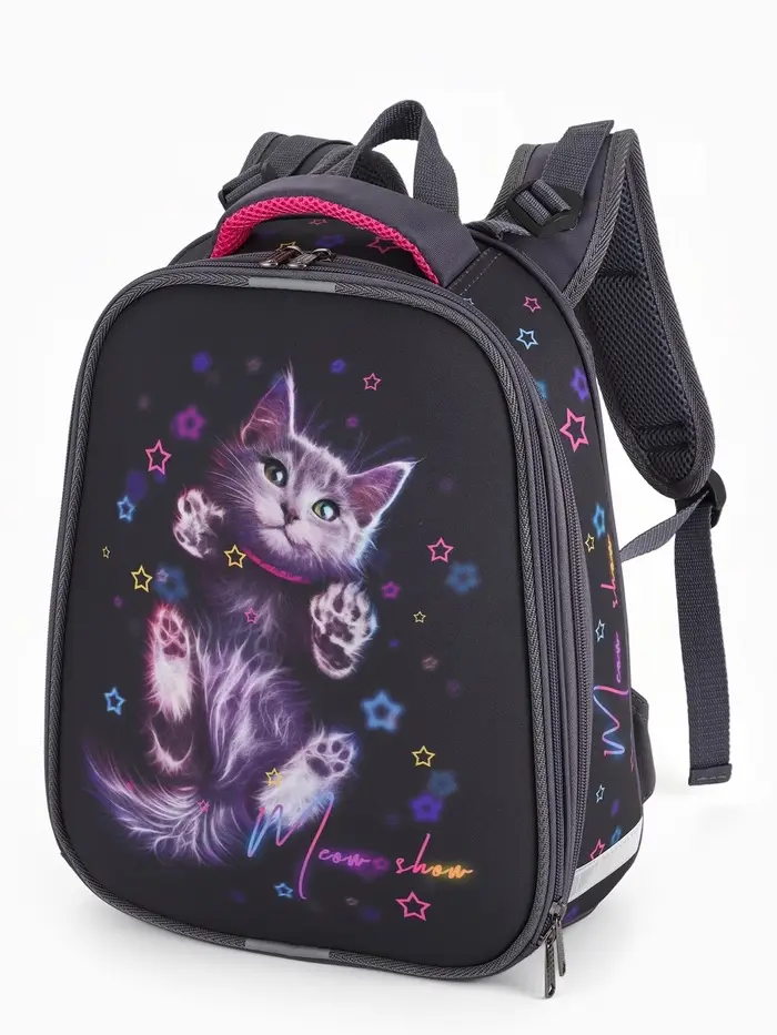 Этот школьный рюкзак для девочки создан, чтобы каждый учебный день был комфортным и ярким. Эргономичная каркасная конструкция с жёсткой спинкой повторяет естественные изгибы, бережно распределяя вес и помогая сохранять правильную осанку. Два просторных отделения вместят всё необходимое для учёбы в начальной школе, а милый рисунок с котиком и звёздочками делают его настоящим другом для своей хозяйки.