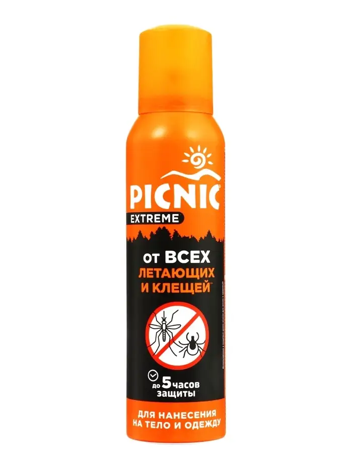 Репеллентный аэрозоль Picnic Extreme - это мощное средство для отпугивания комаров, клещей, мошек и других кровососущих насекомых. Специальная формула обеспечивает длительную защиту в условиях повышенной активности вредителей - в лесу, на охоте, рыбалке и в длительных походах. Объема 150 мл хватит на несколько применений для всей семьи.