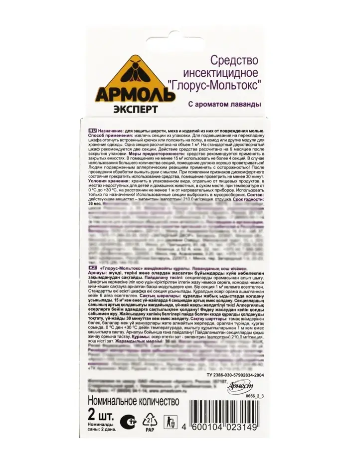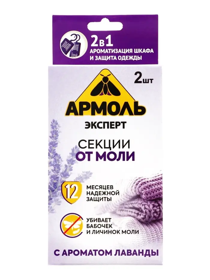Подвесные секции от моли «Глорус-Мольтокс» с ароматом лаванды - это эффективное средство для уничтожения платяной моли и защиты одежды. Секции пропитаны специальным составом, который испаряется в закрытом пространстве шкафа, создавая среду, губительную для моли и ее личинок. Приятный аромат лаванды освежает вещи и служит дополнительным отпугивающим фактором. В упаковке 2 секции - достаточно для обработки небольшого гардероба.